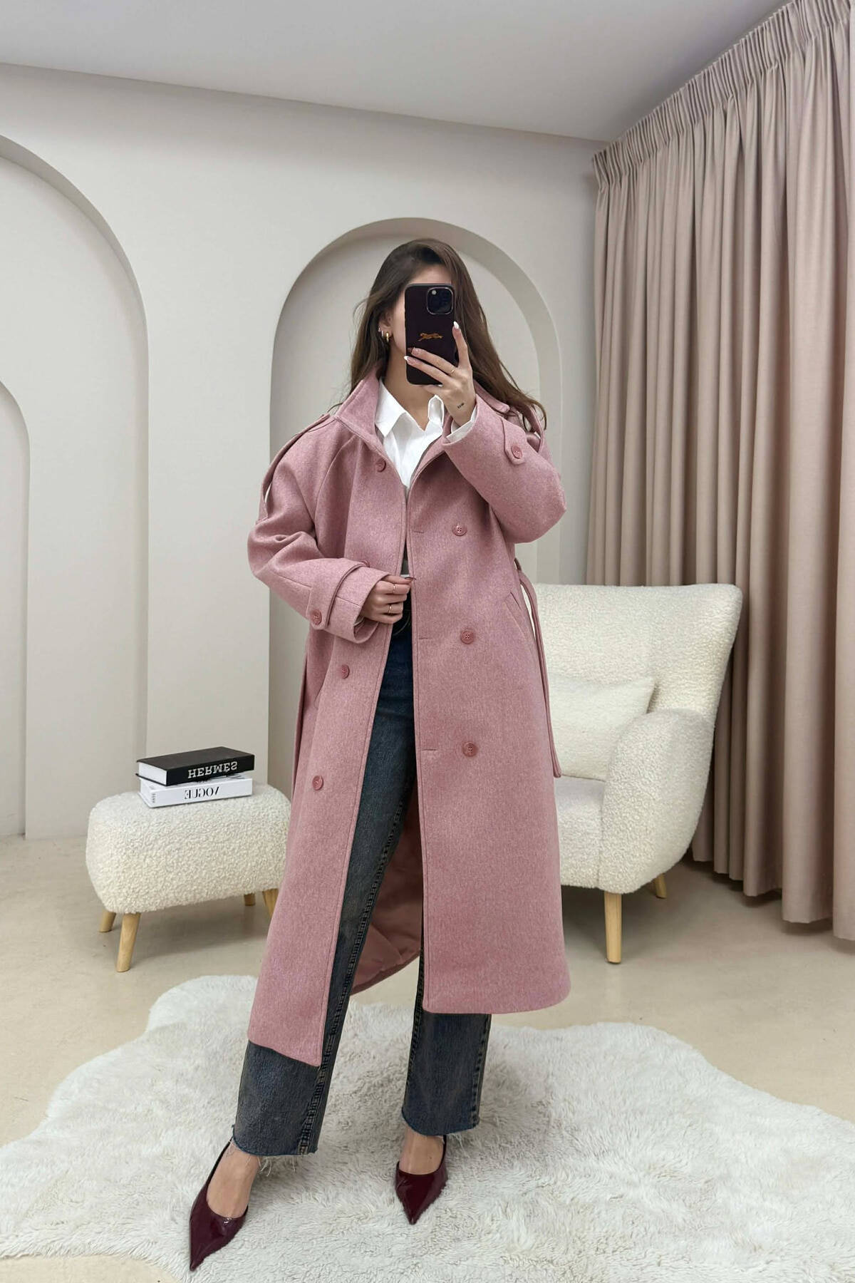 PALLTO PELLUSHI ME KAPUÇ DHE BUTONA PER FEMRA NE NGJYRE VISHNJE