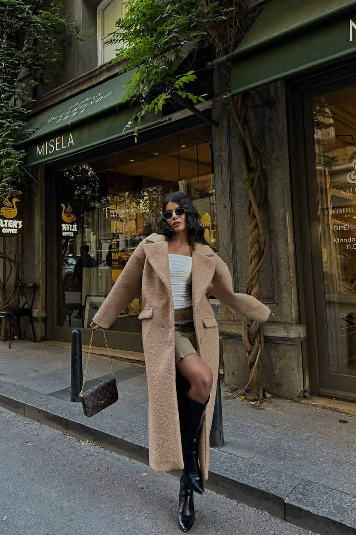 PALLTO KAMOSH NJE NGJYRESHE ME DETAJIN E LIDHSEVE PER FEMRA NE NGJYRE KAFE