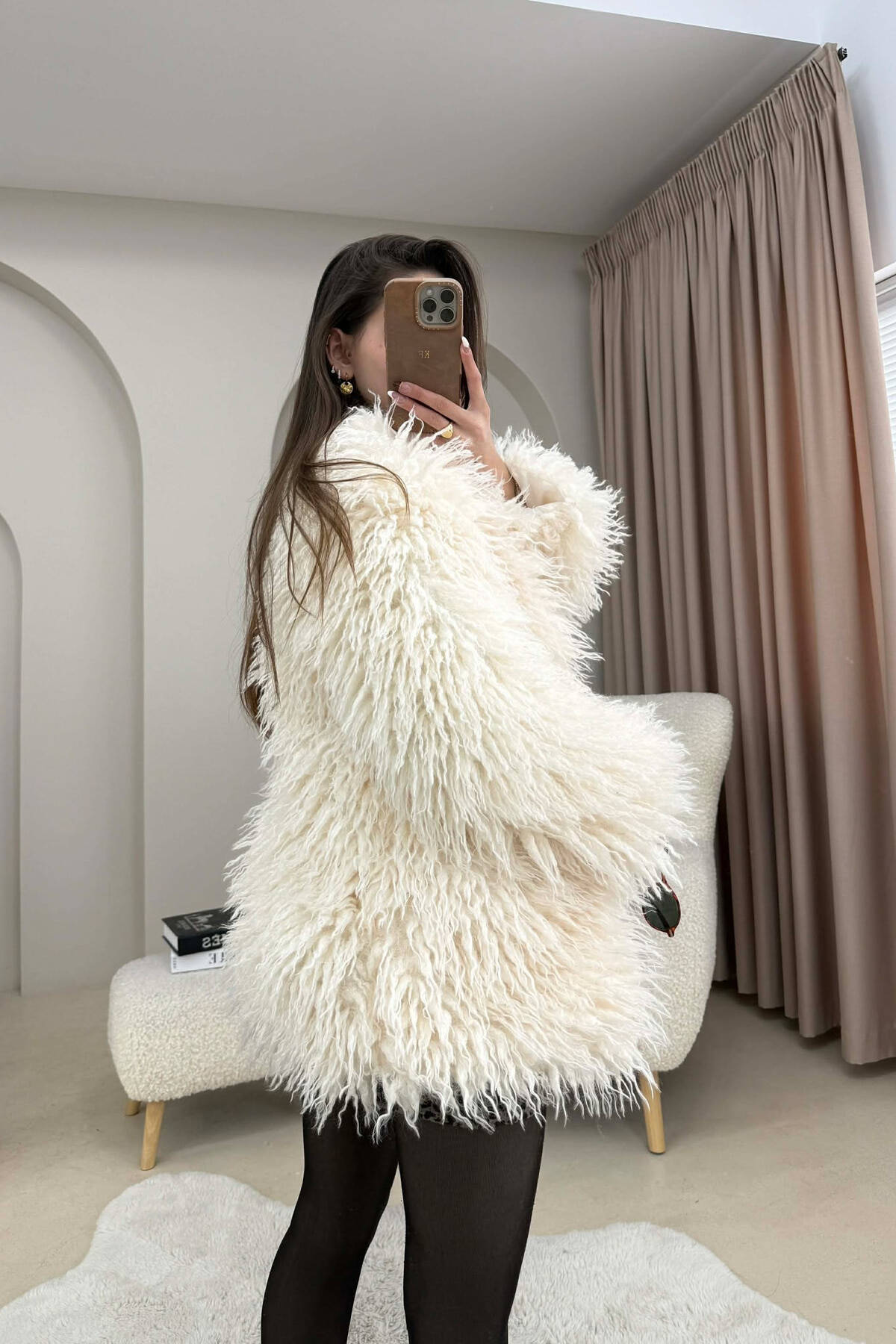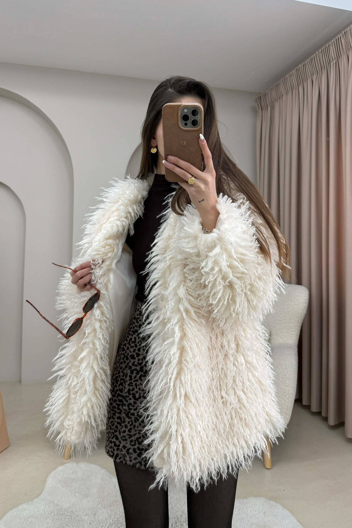 ONE COLOR BUTTONED FAUX FUR SHORT WOMAN COAT CREAM/KREM