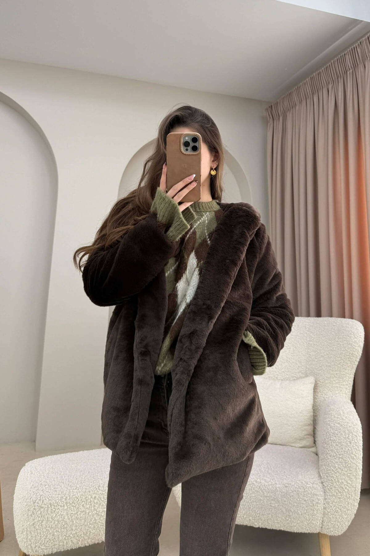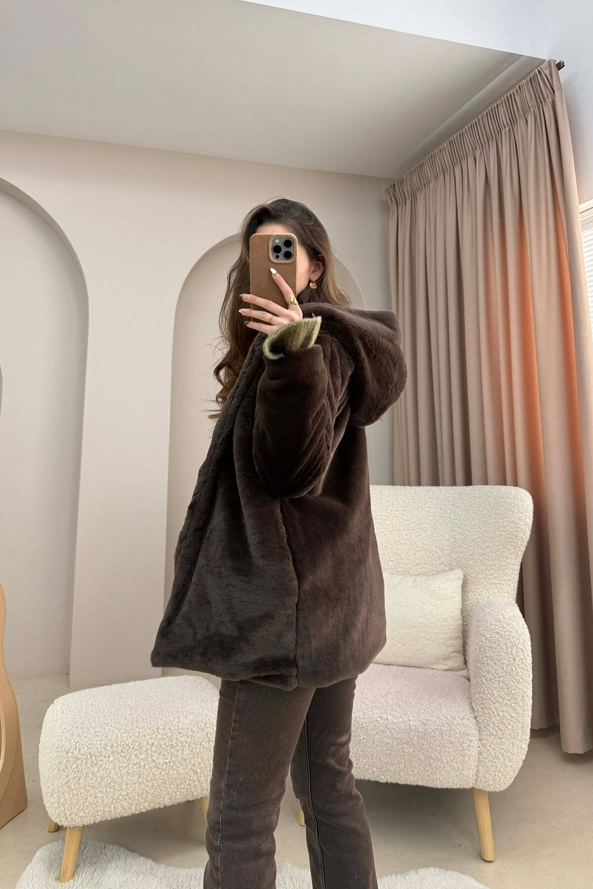 PALLTO PELLUSHI ME KAPUÇ DHE BUTONA PER FEMRA NE NGJYRE KAFE