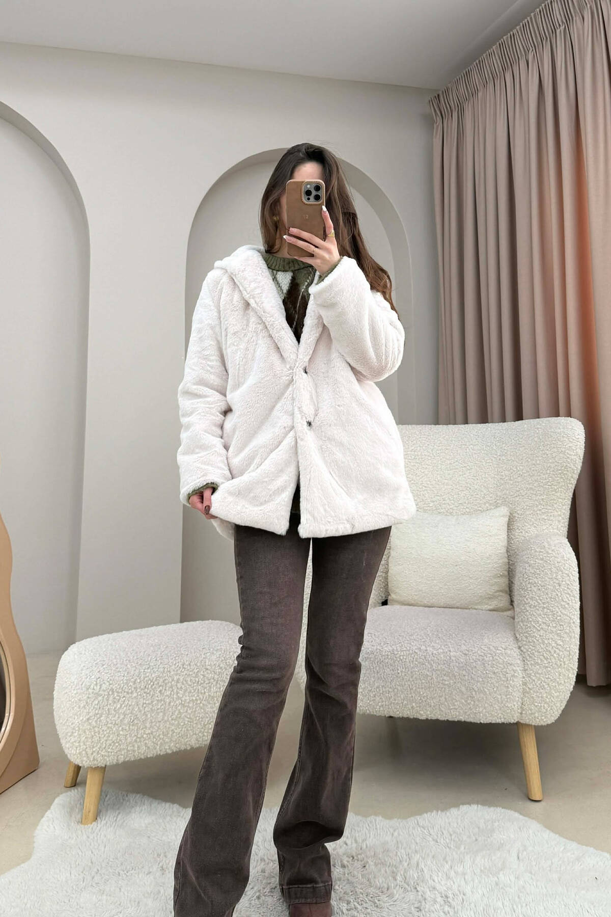 PALLTO PELLUSHI ME KAPUÇ DHE BUTONA PER FEMRA NE NGJYRE KAFE
