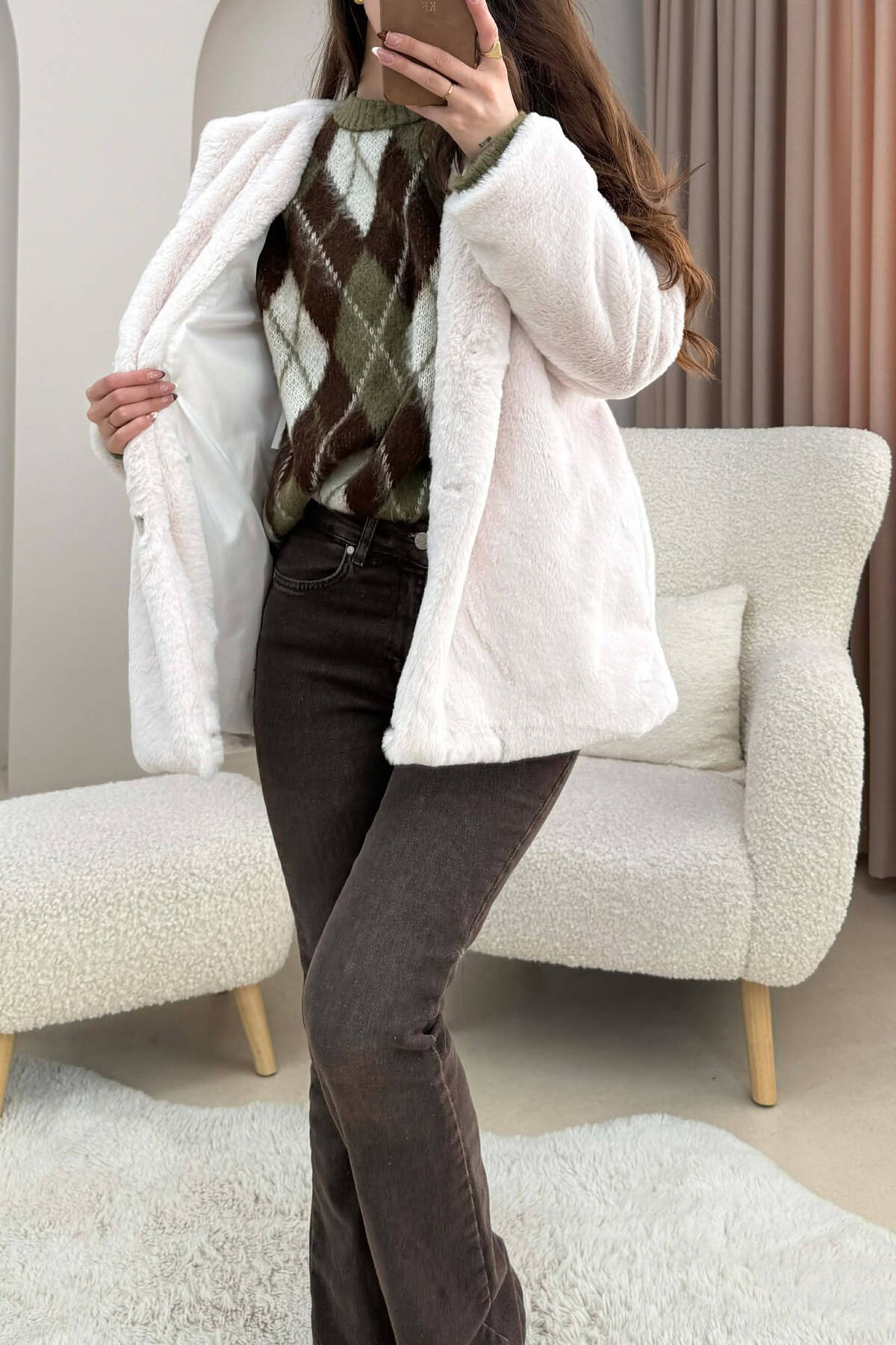ONE COLOR BUTTONED FAUX FUR SHORT WOMAN COAT CREAM/KREM