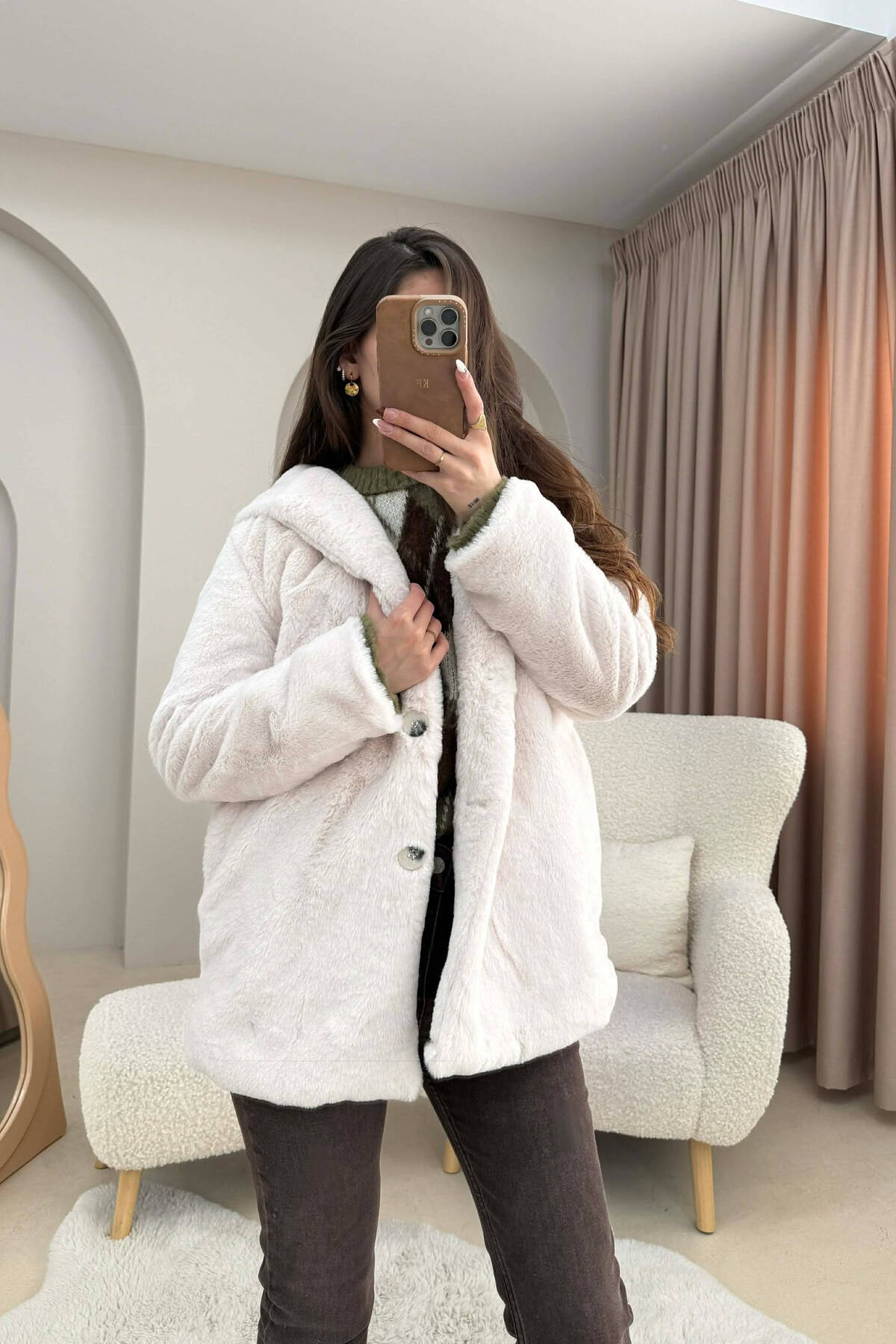 PALLTO PELLUSHI ME KAPUÇ DHE BUTONA PER FEMRA NE NGJYRE KREM
