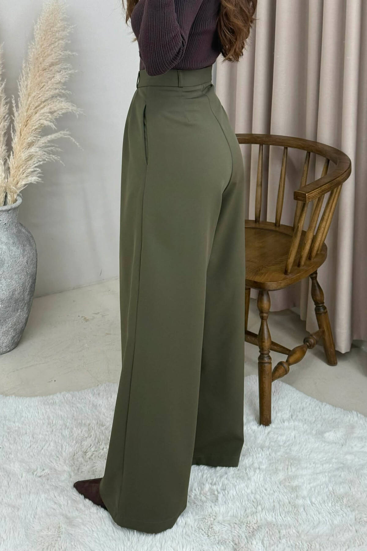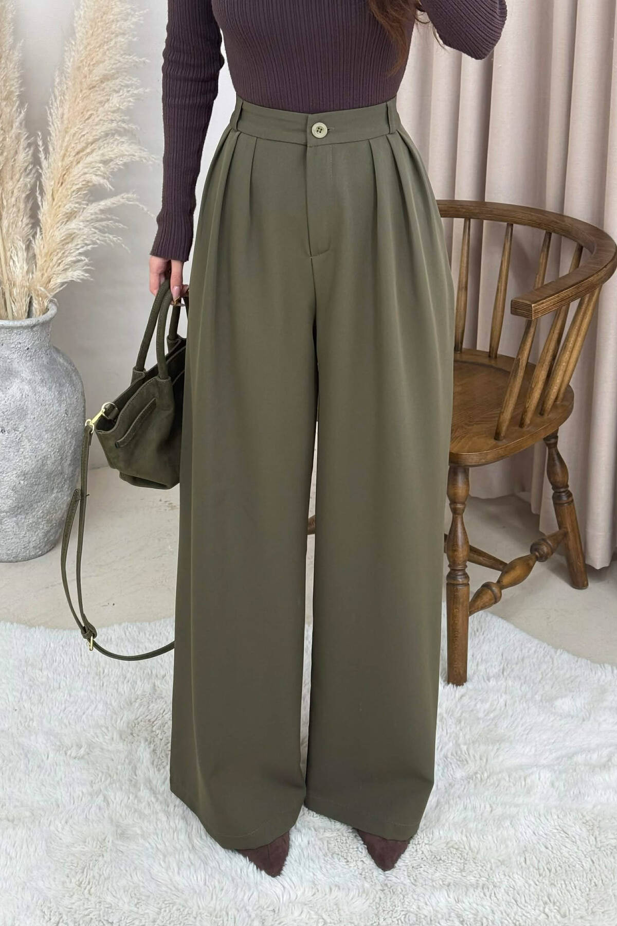 PANTALLONA TE GJERA NJE NGJYRESHE ME DETAJIN E RRIPIT PER FEMRA NE NGJYRE KAFE TE ERRET