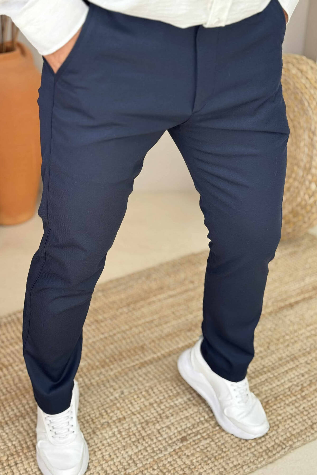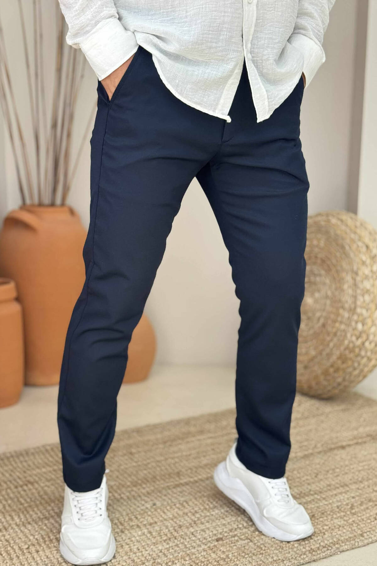 PANTALLLONA KLASIKE TË THJESHTA NJËNGJYRËSHE PËR MESHKUJ NË NGJYRËN BLU TË ERRËT