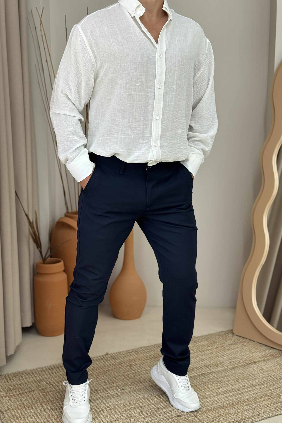 PANTALLONA NJË NGJYRËSHE TË THJESHTA PËR MESHKUJ NË NGJYRËN BEZHË E ZBARDHUR