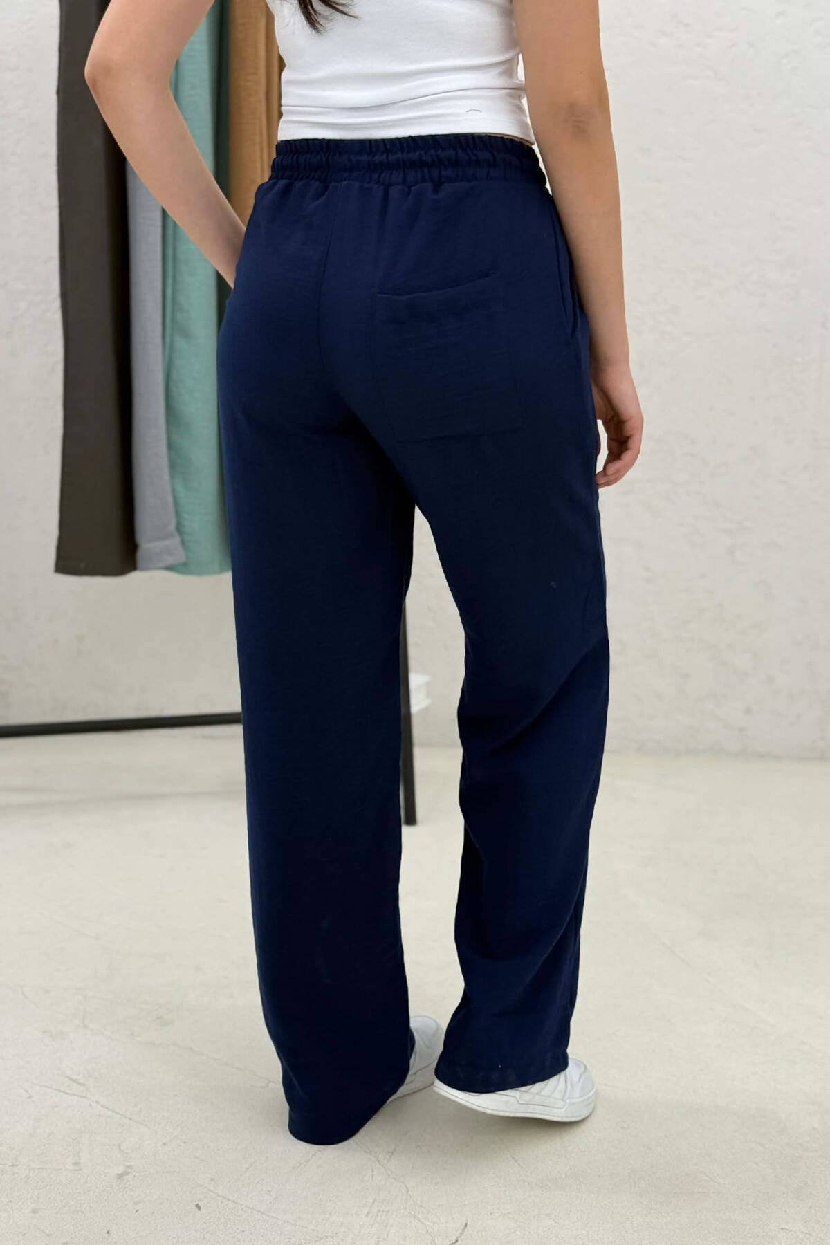 PANTALLONA TE GJERA NJE NGJYRESHE ME DETAJIN E RRIPIT PER FEMRA NE NGJYRE BLU