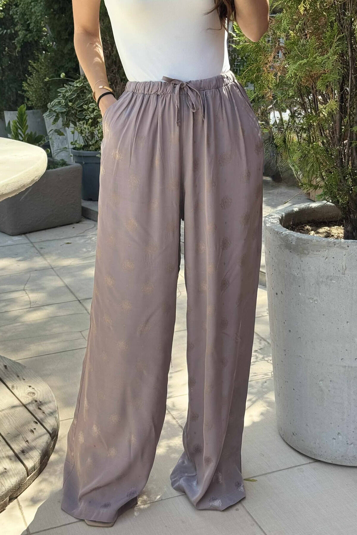 PANTALLONA ME DIZANJ ELASTIKE NË BELI DHE ME LIDHËSE PËR FEMRA NË NGJYRËN KAFE TË ZBARDHUR