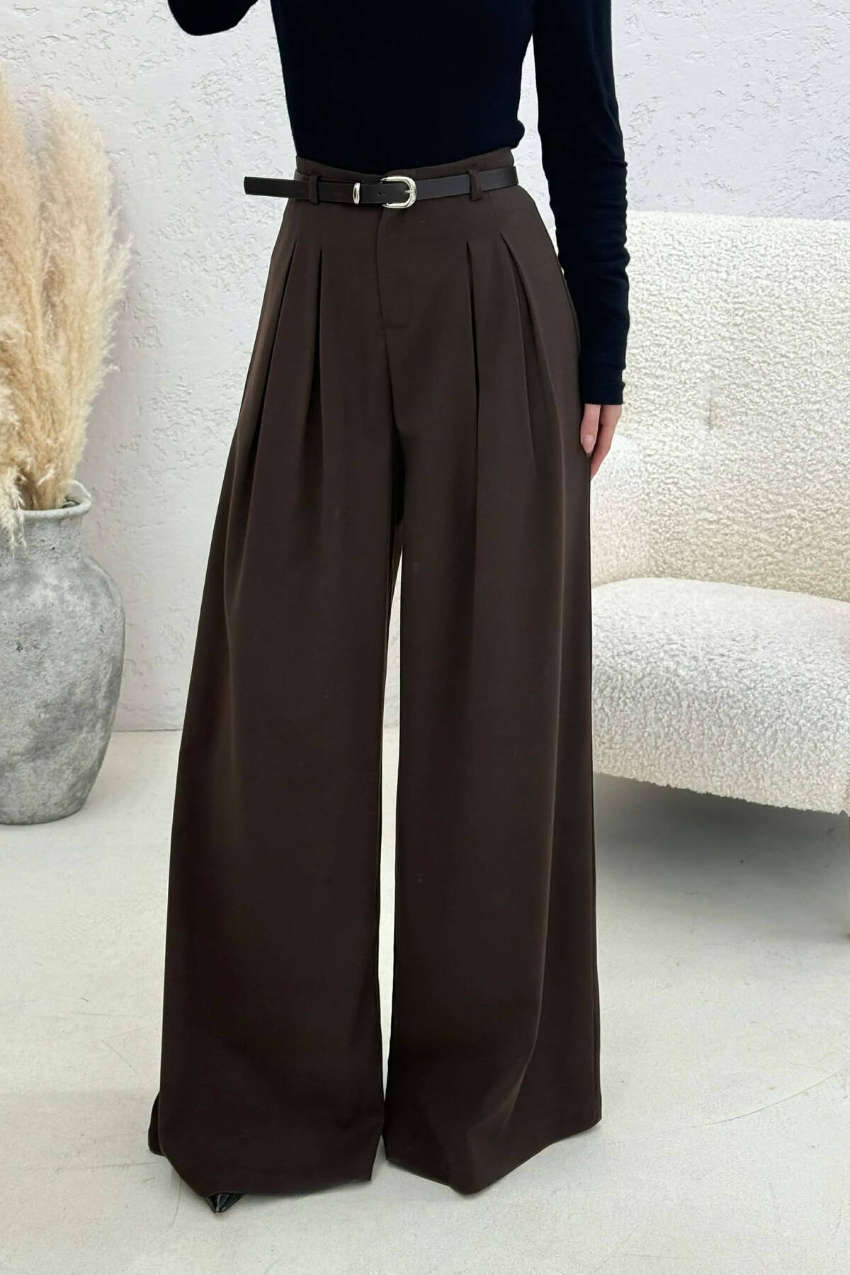 PANTALLONA TE GJERA ME BEL ELASTIK PER FEMRA NE NGJYRE KAFE