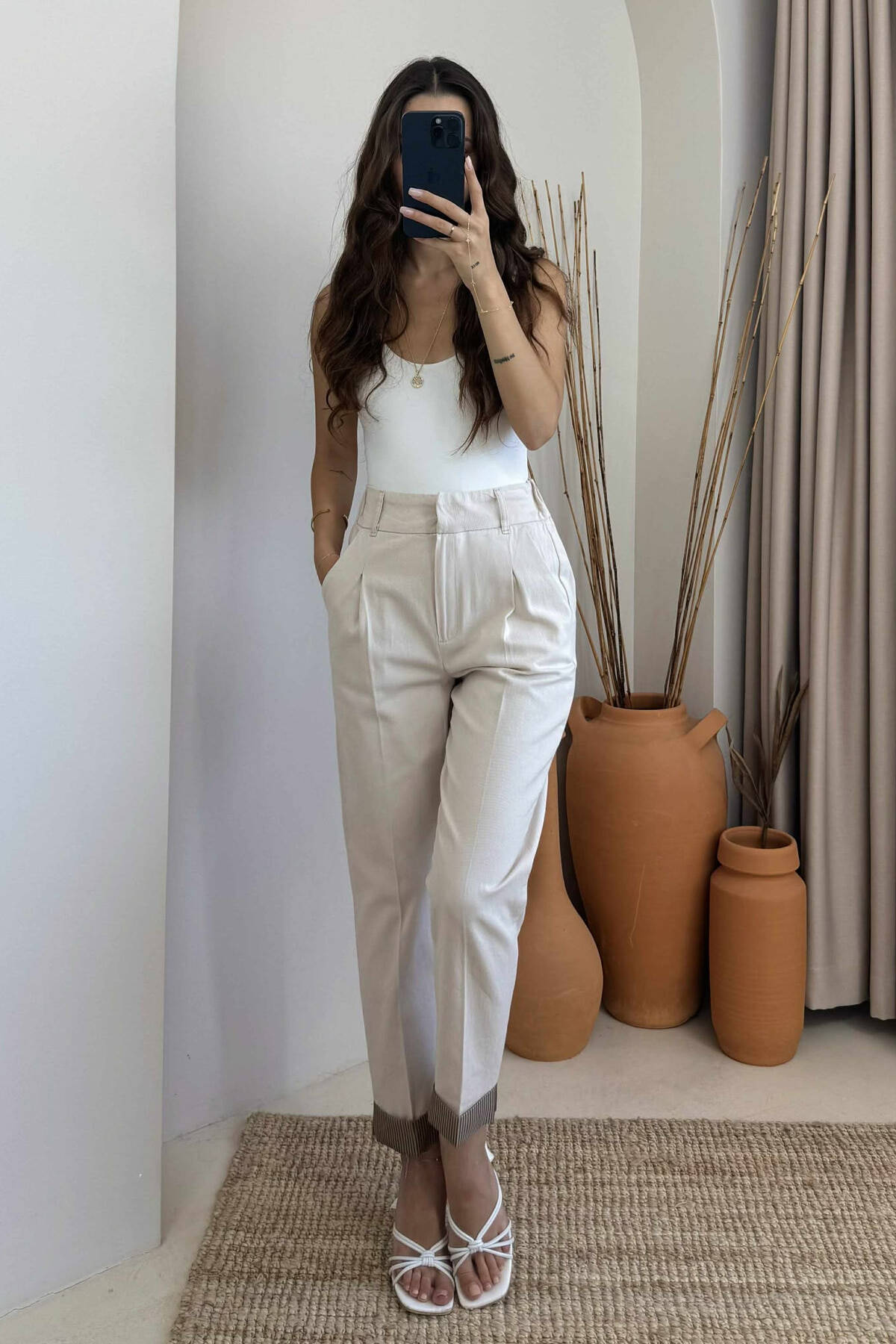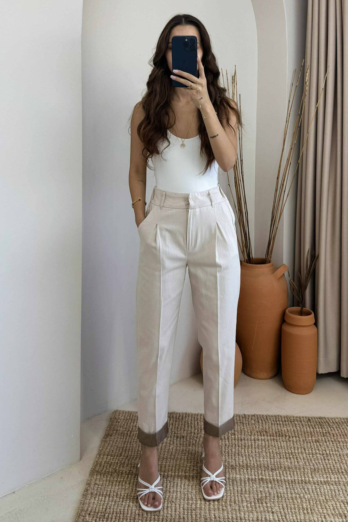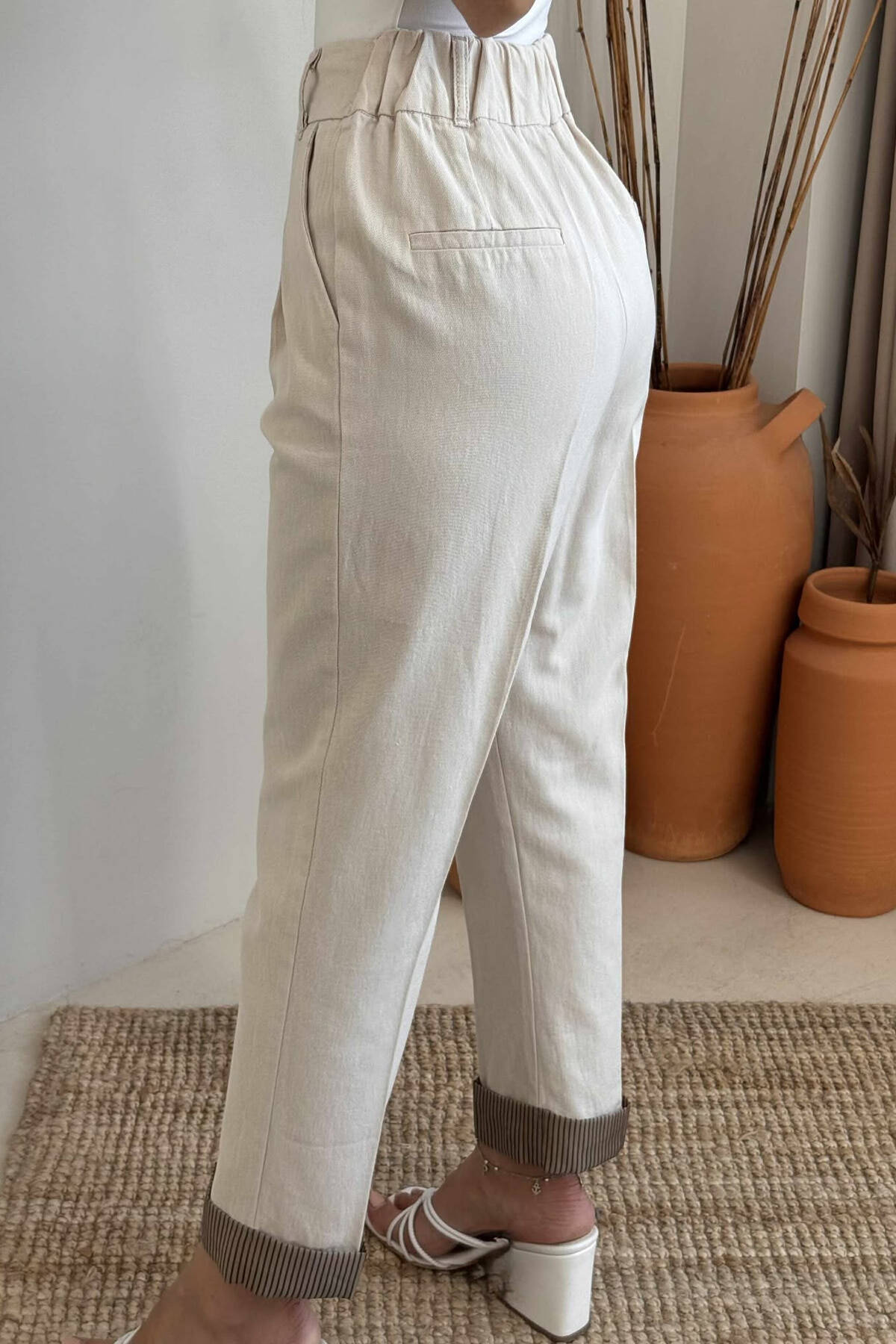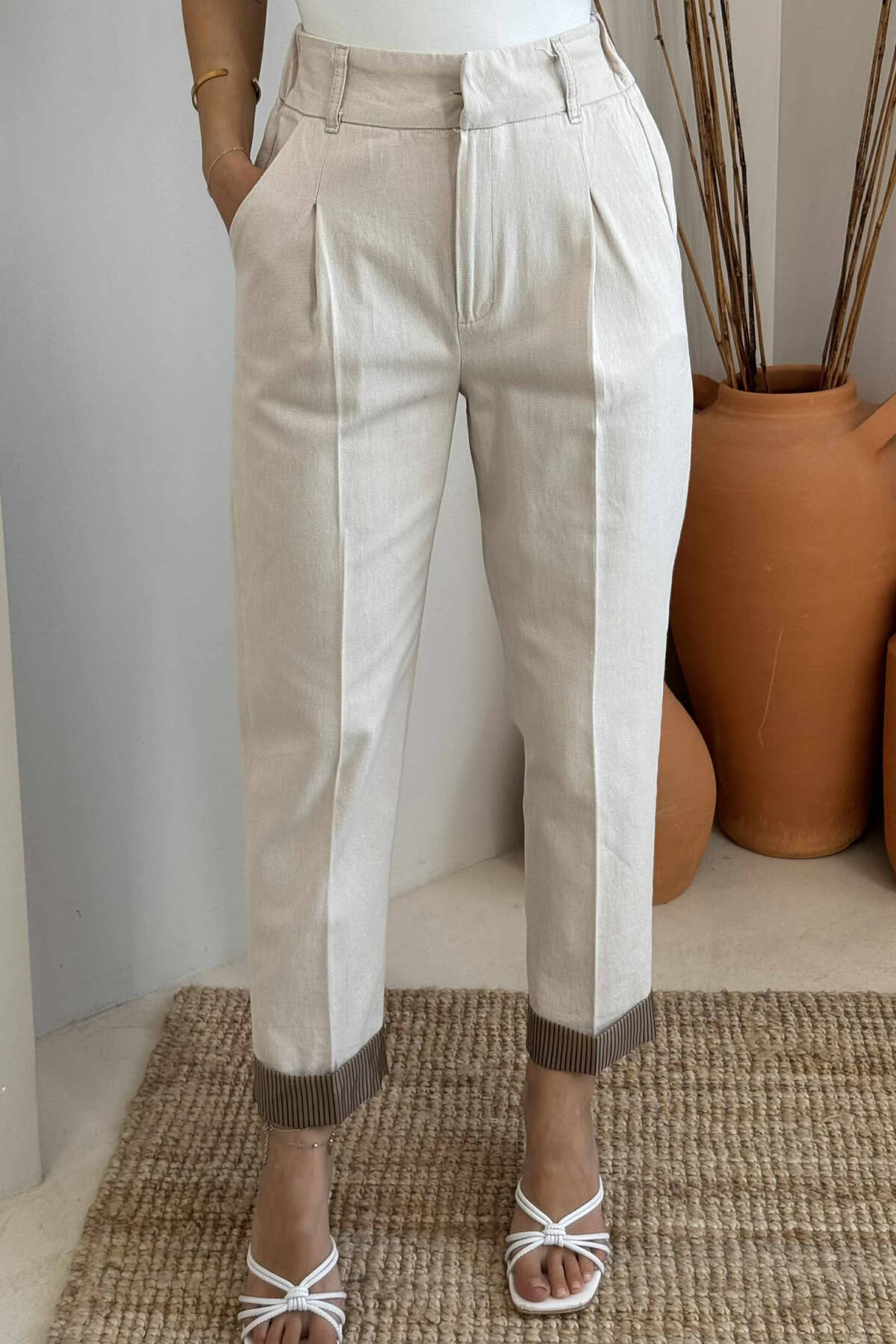 PANTALLONA ME DETAJIN E RRIPIT PER FEMRA NE NGJYRE BEZHE