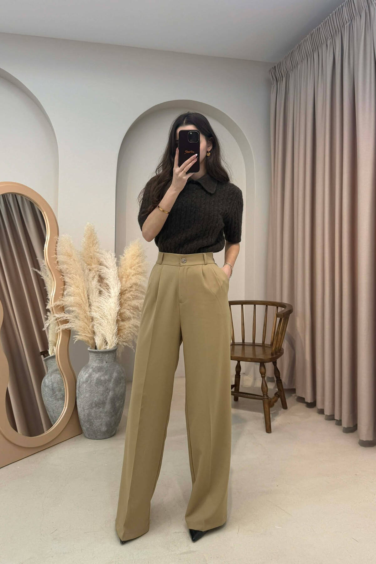 PANTALLONA TE GJERA NJE NGJYRESHE ME DETAJIN E RRIPIT PER FEMRA NE NGJYRE KAFE TE ERRET