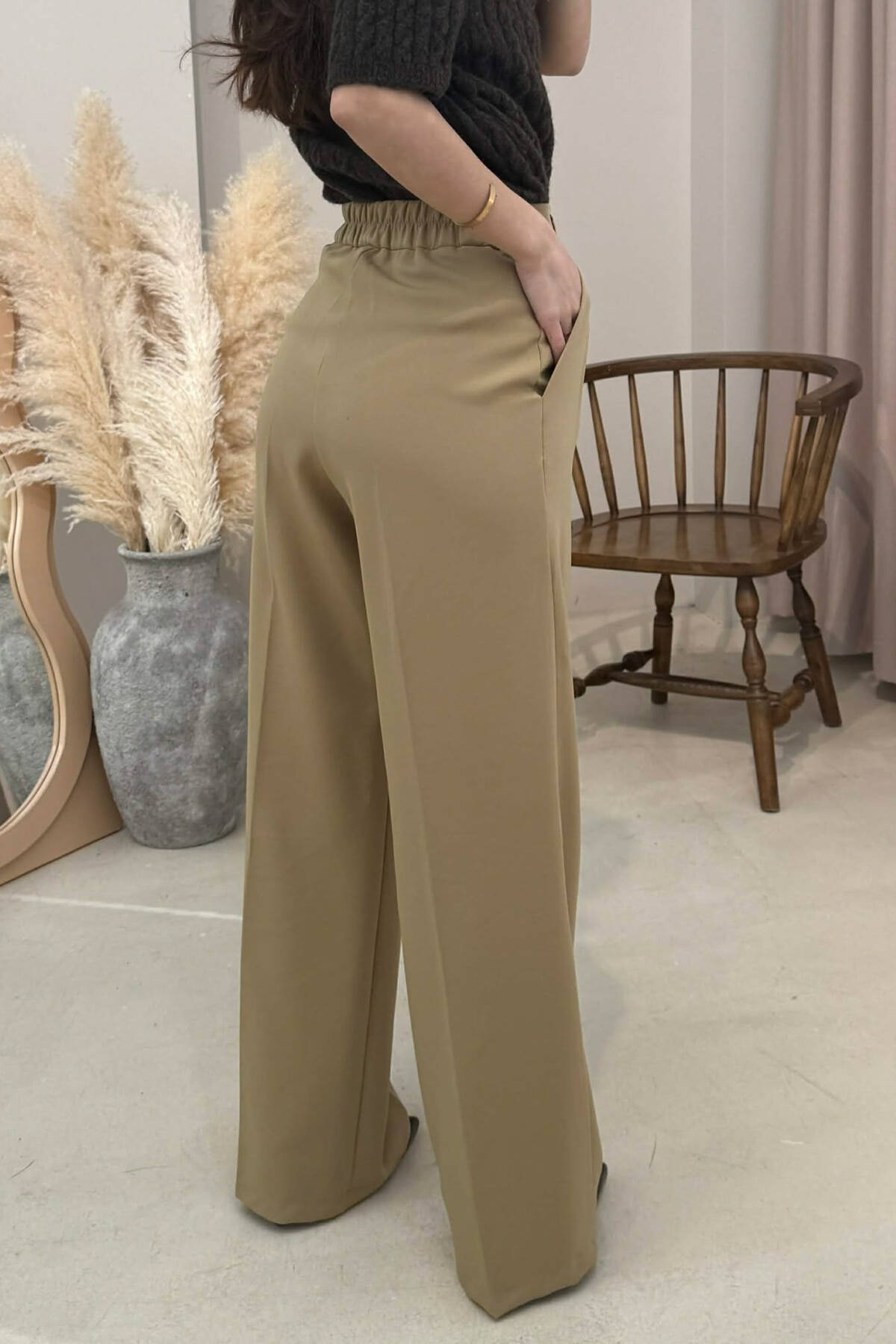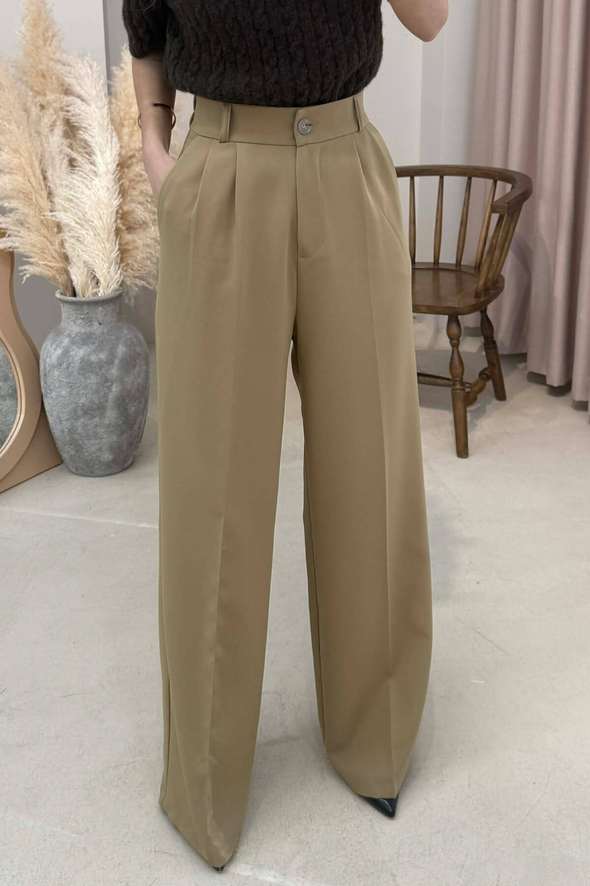 PANTALLONA TE GJERA NJE NGJYRESHE ME DETAJIN E RRIPIT PER FEMRA NE NGJYRE BEZHE