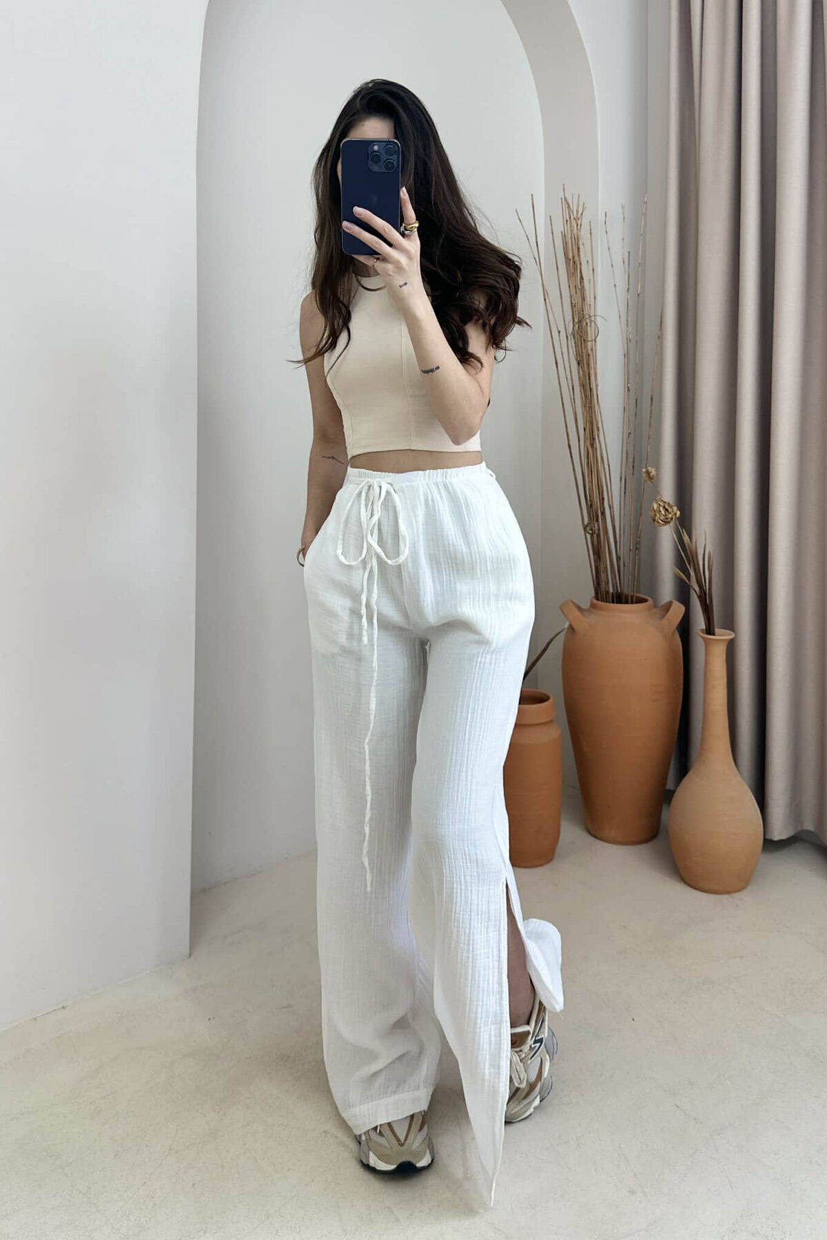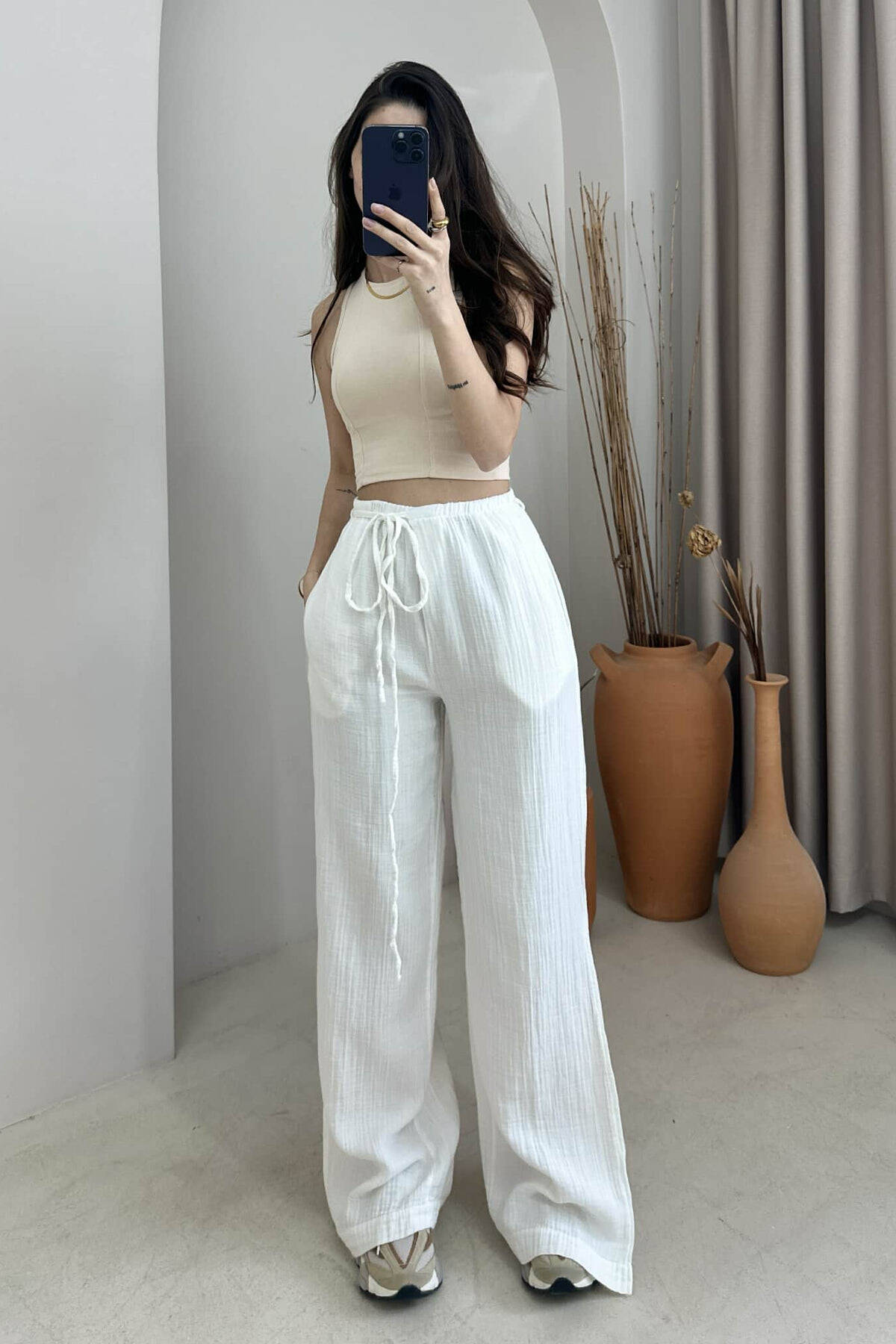 PANTALLONA NJË NGJYRËSHE ME DETAJIN E LIDHSES PËR FEMRA NË NGJYRË E BARDHË