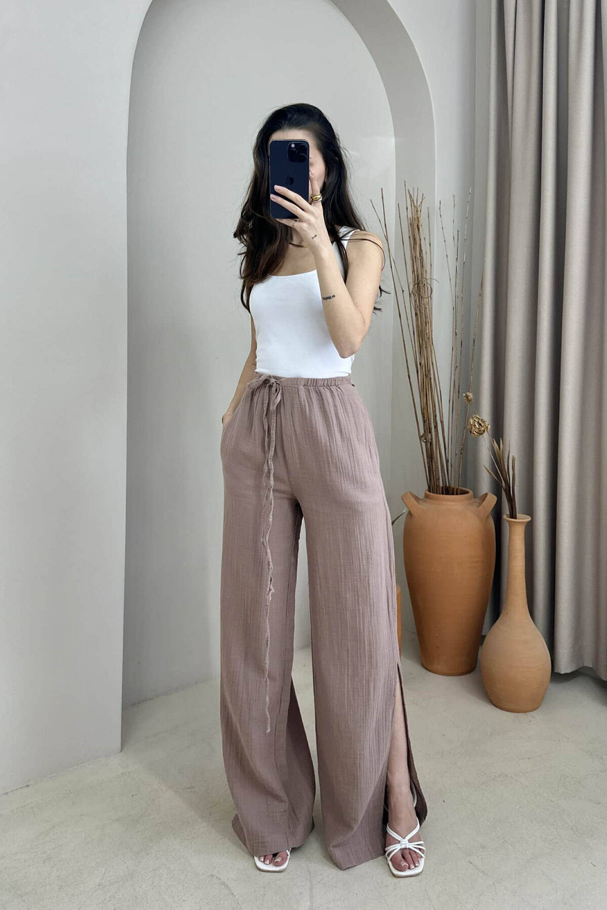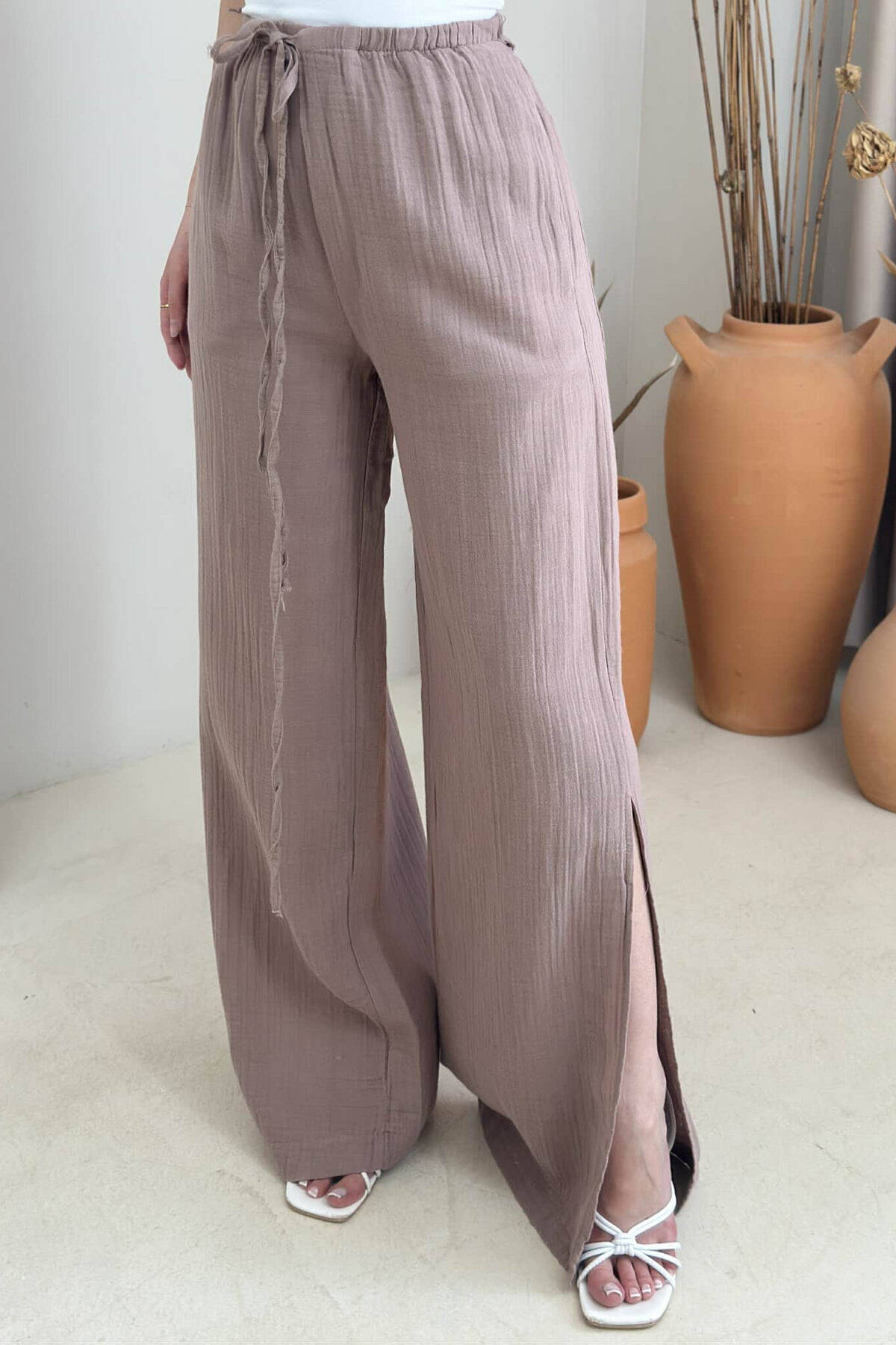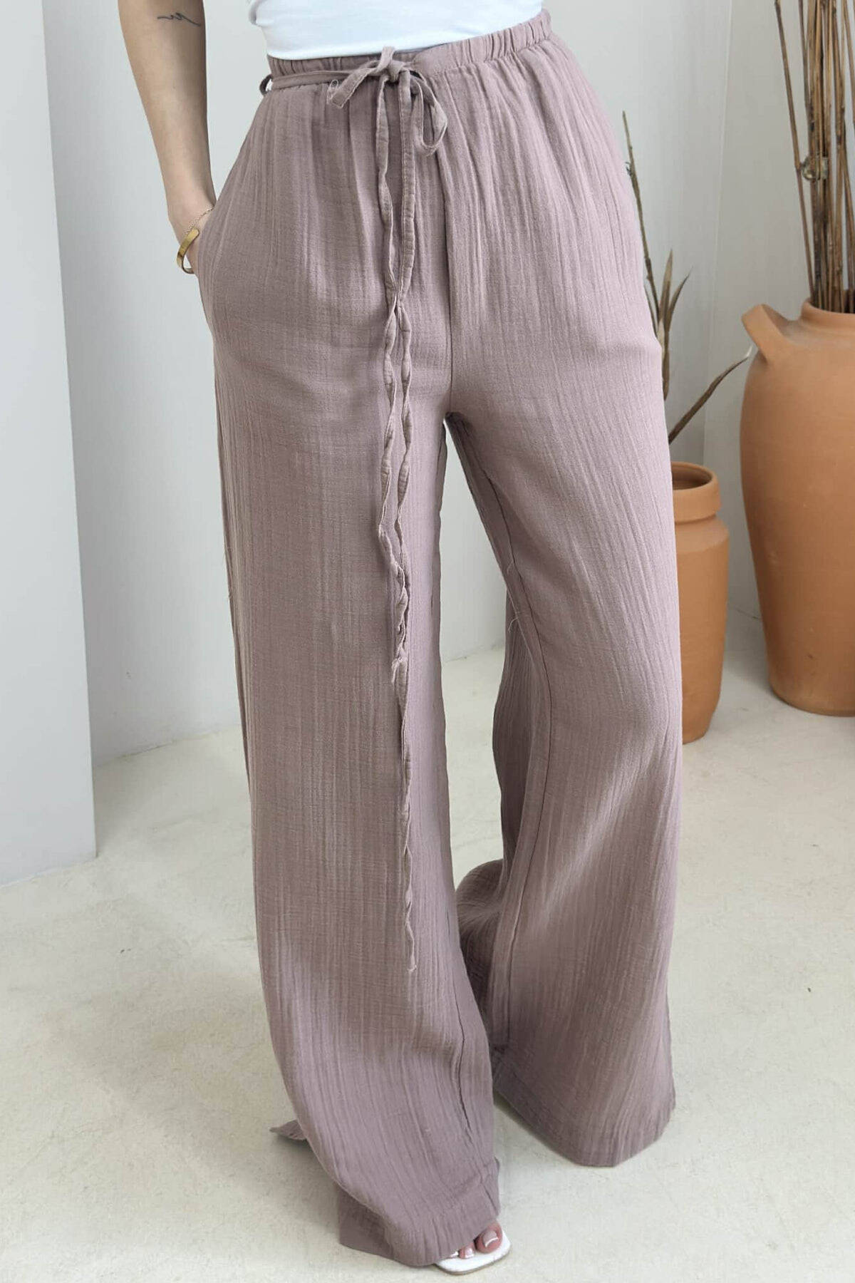 PANTALLONA NJË NGJYRËSHE ME DETAJIN E LIDHSES PËR FEMRA NË NGJYRË UTHULL