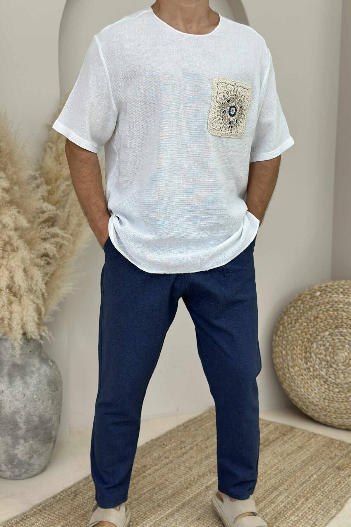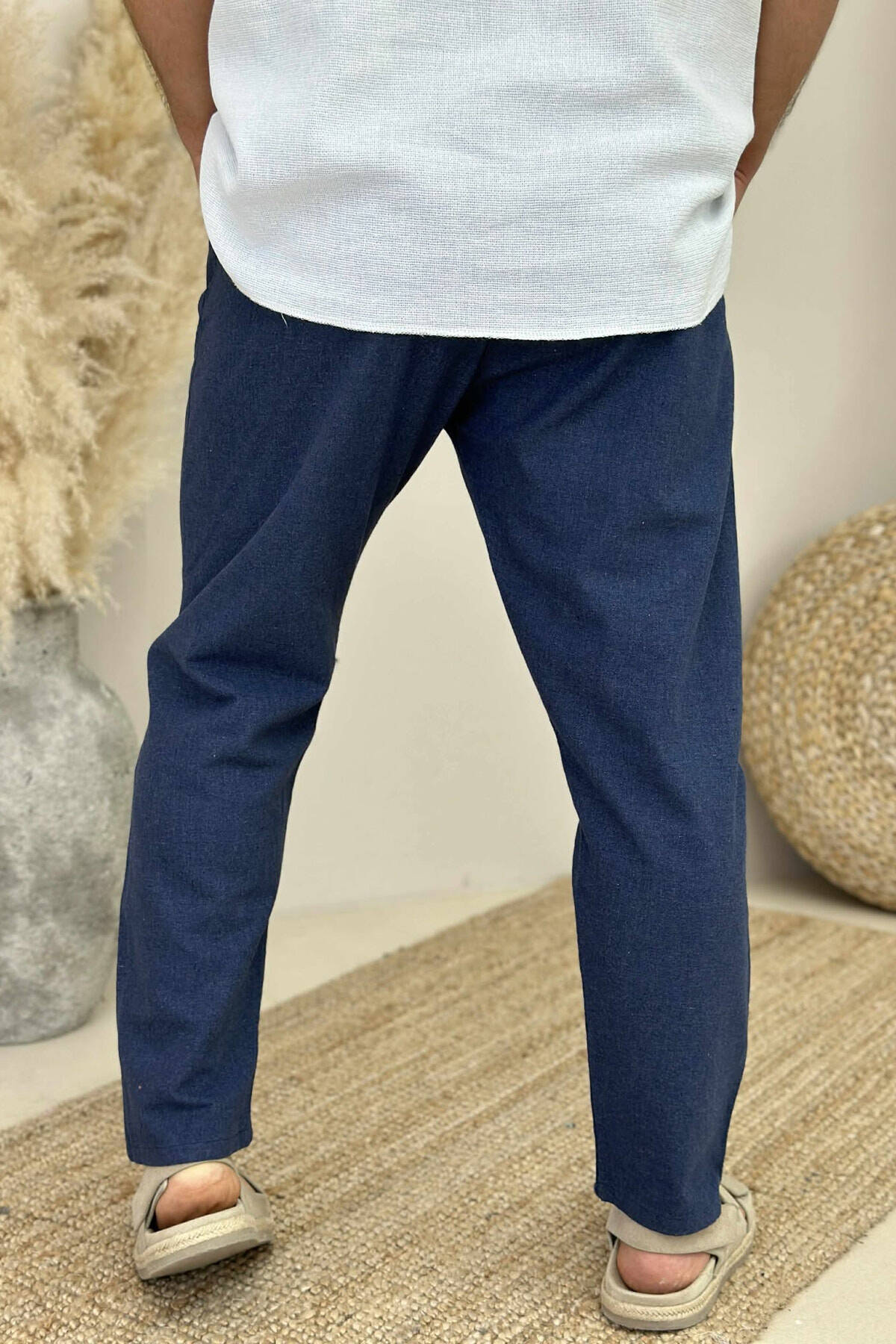 PANTALLONA NJË NGJYRËSHE ME DETAJIN E LIDHSES PËR MESHKUJ NË NGJYRËN BLU E ERRËT