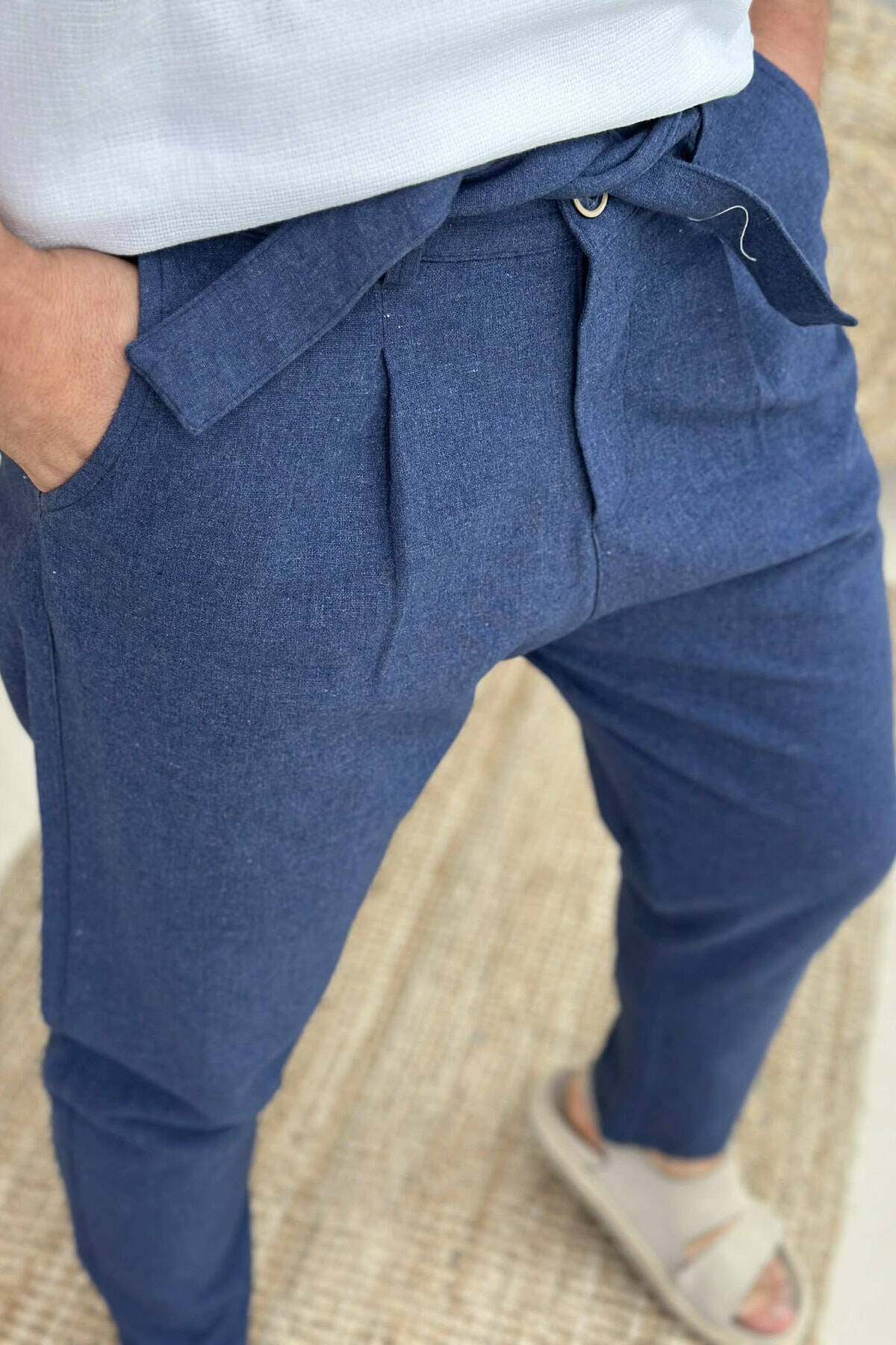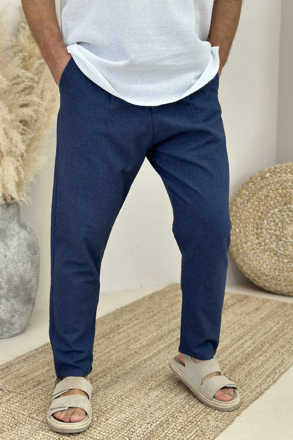 PANTALLONA TË THJESHTA NJËNGJYRËSHE DHE ME LIDHËSE PËR MESHKUJ NË NGJYRËN BLU