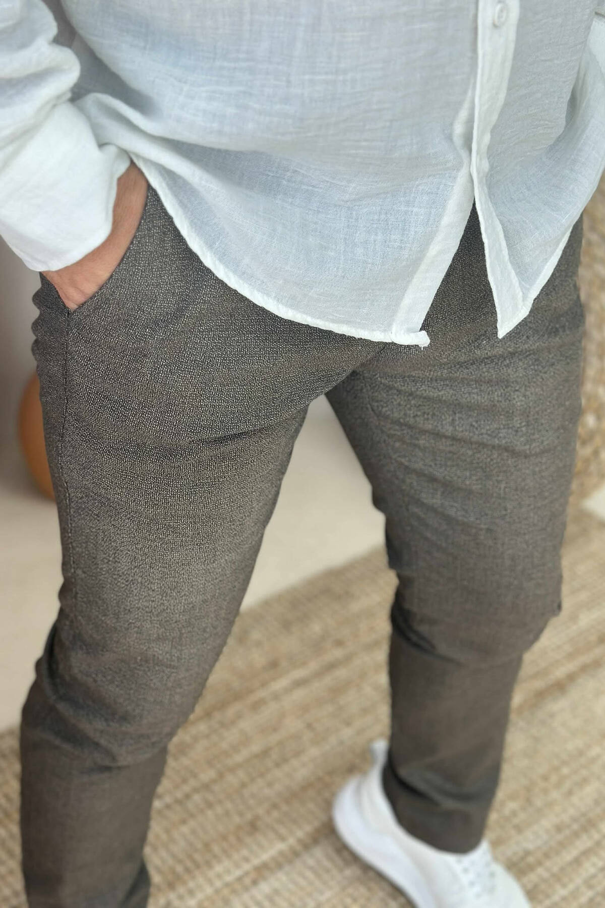 PANTALLONA NJËNGJYRËSHE ELASTIKE NË BELI DHE ME LIDHËSE PËR MESHKUJ NË NGJYRËN GRI