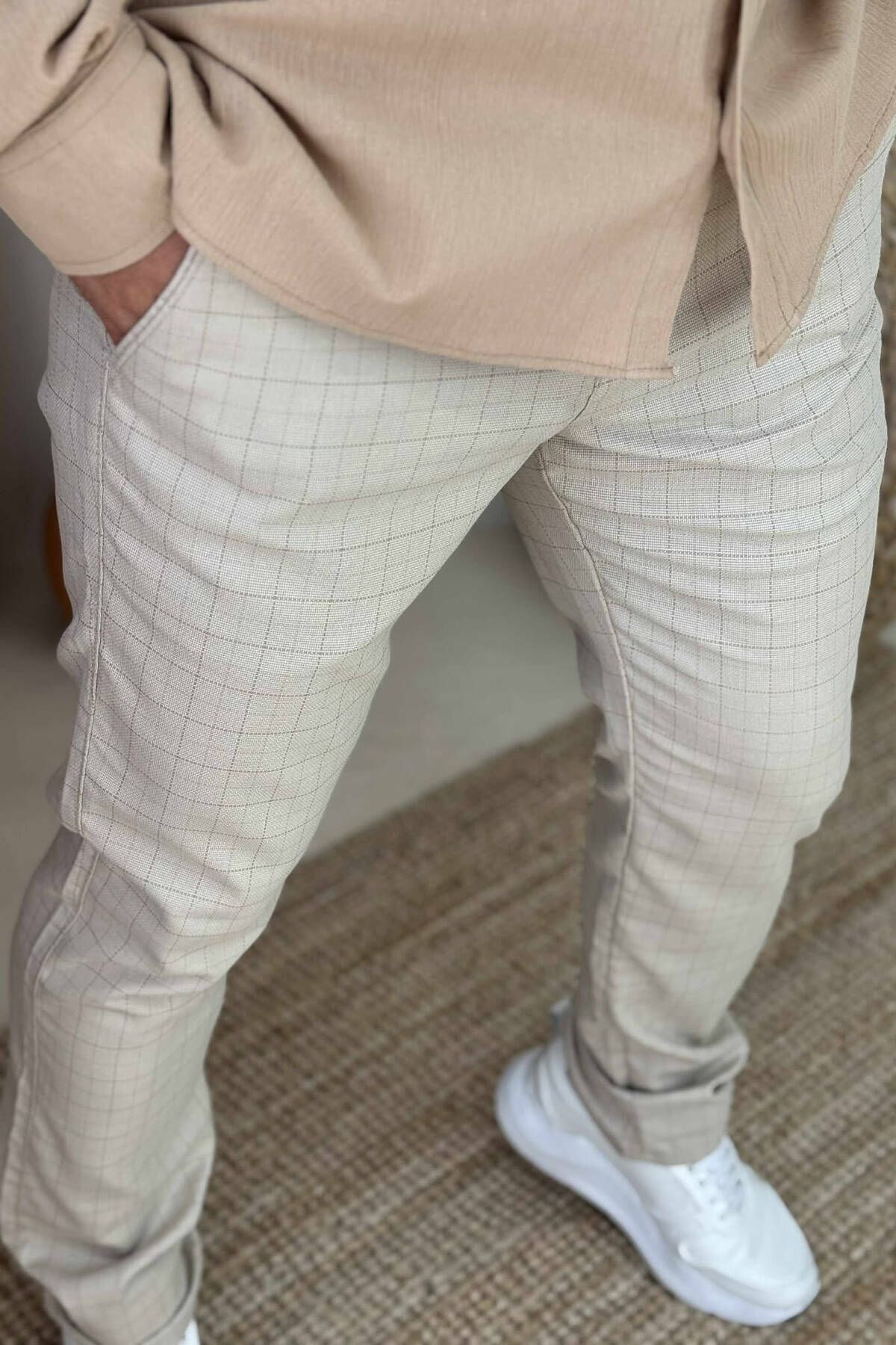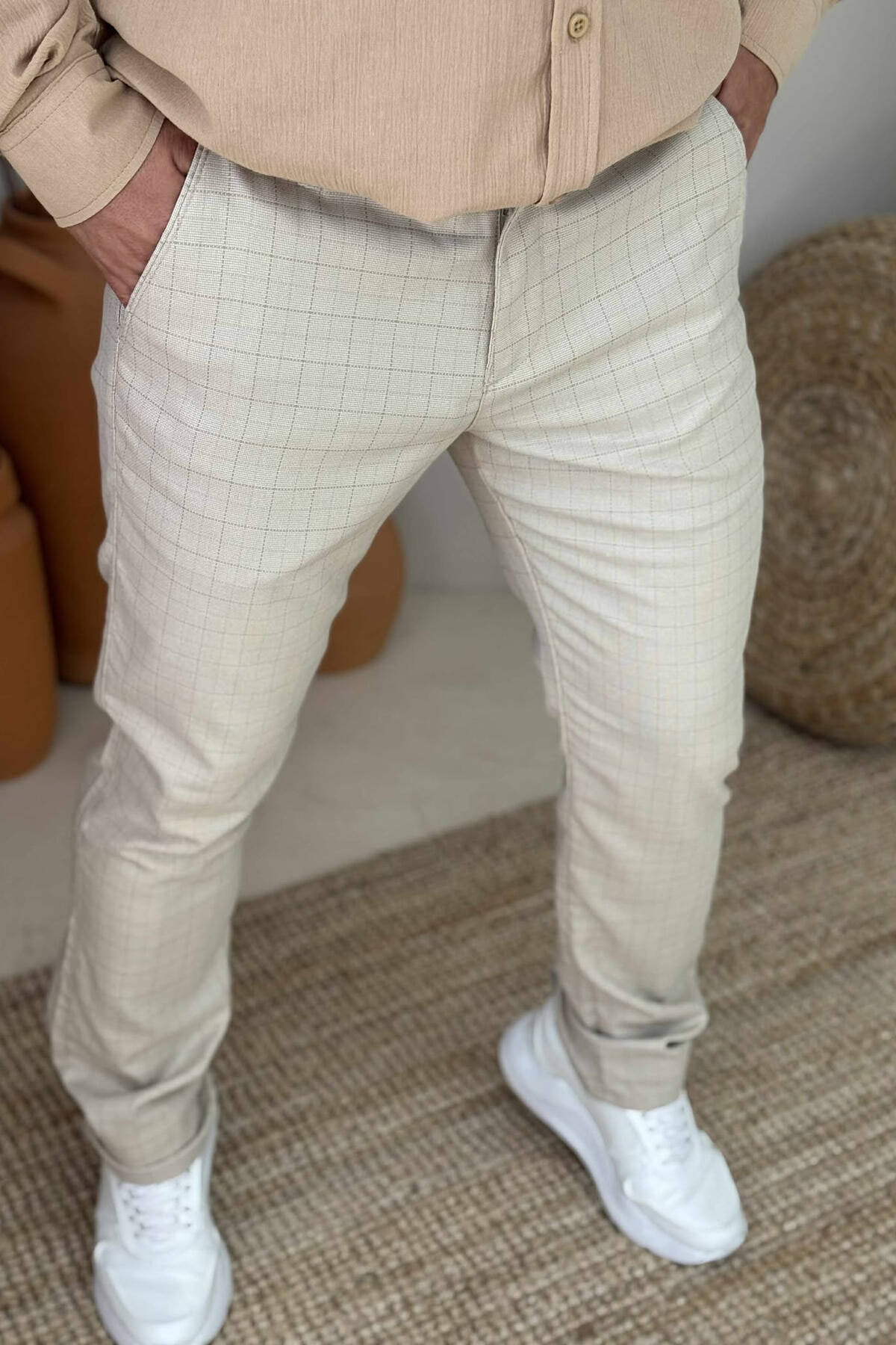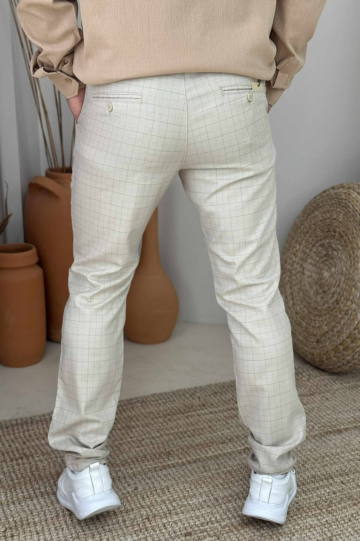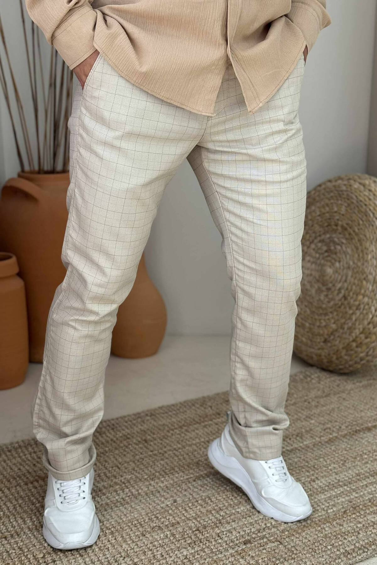 PANTALLONA NJË NGJYRËSHE ME KUADRATA PËR MESHKUJ NË NGJYRËN KREM