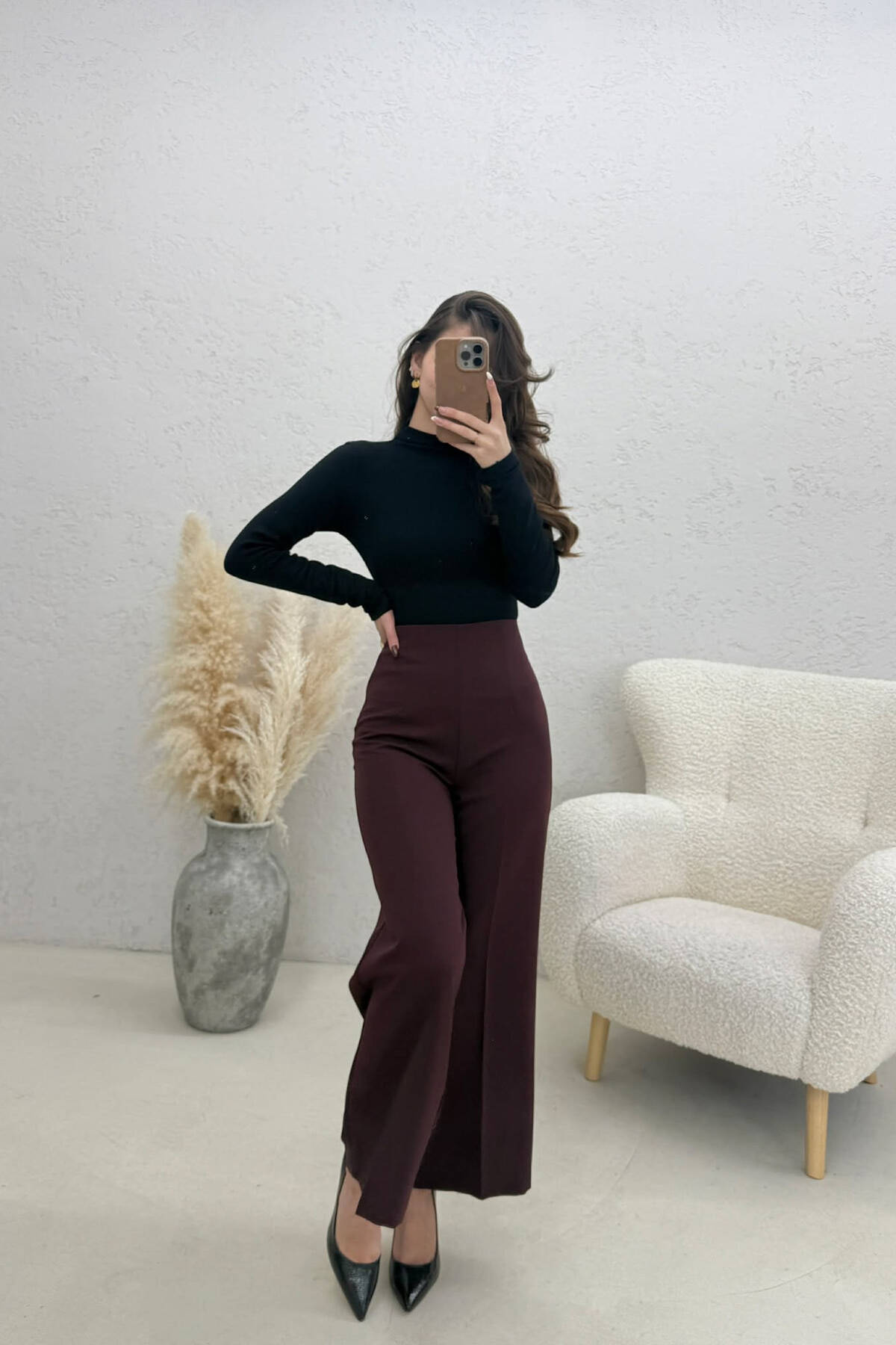 PANTALLONA TE GJERA ME DETAJIN E RRIPIT PËR FEMRA NË NGJYRE KAFE