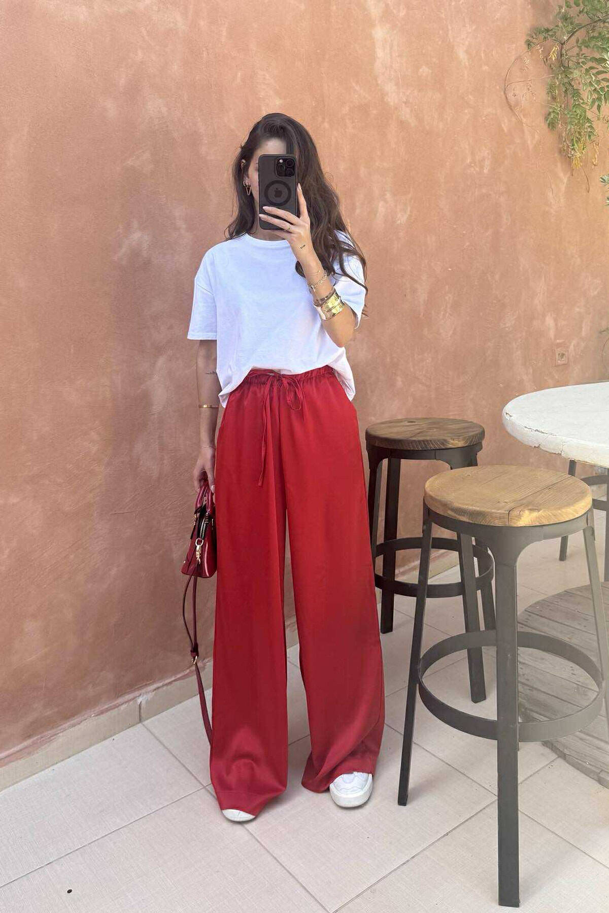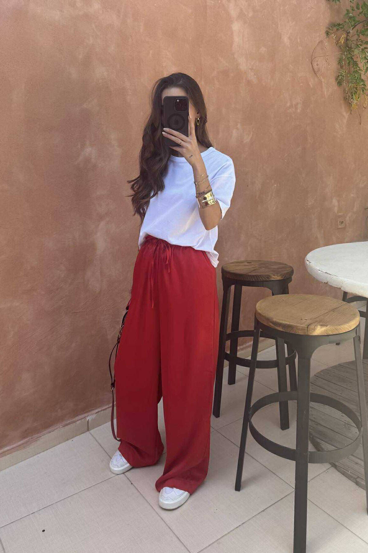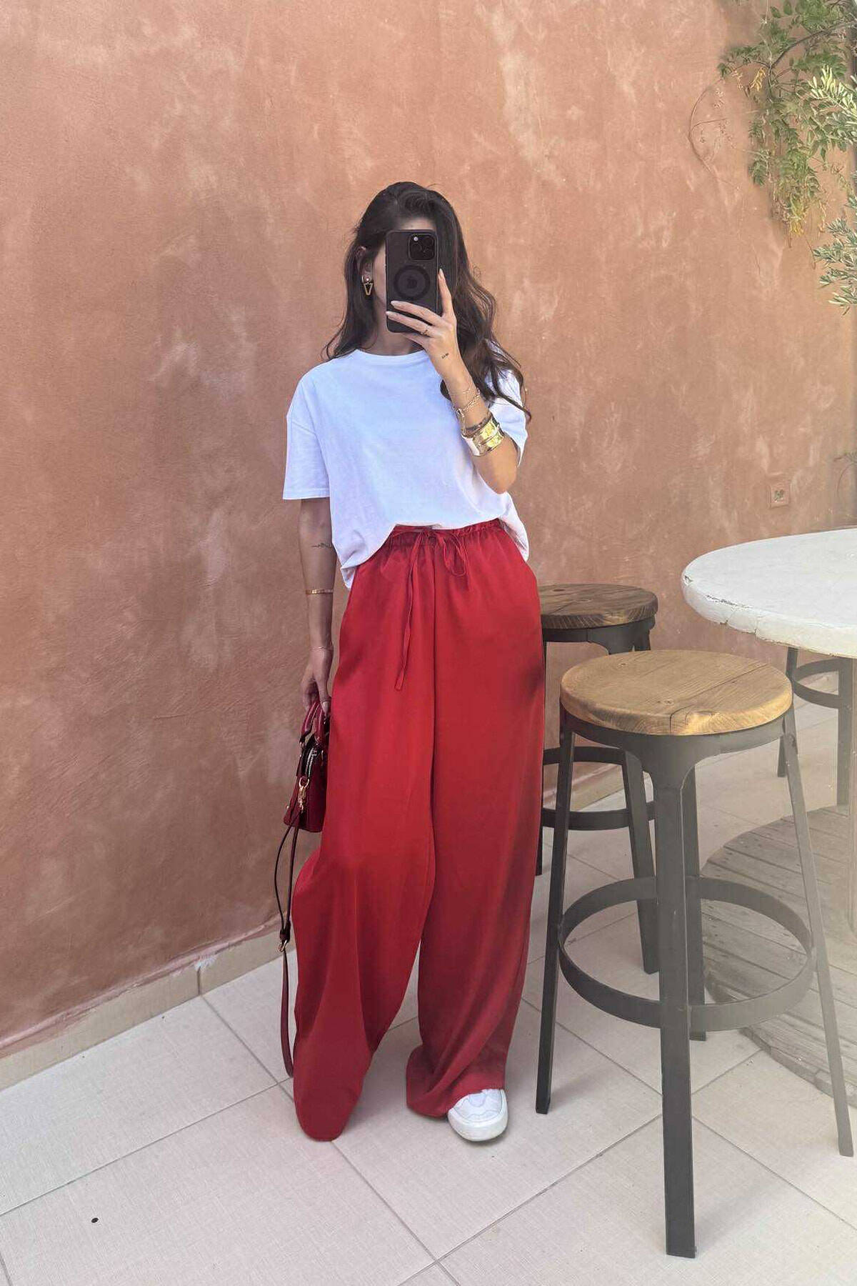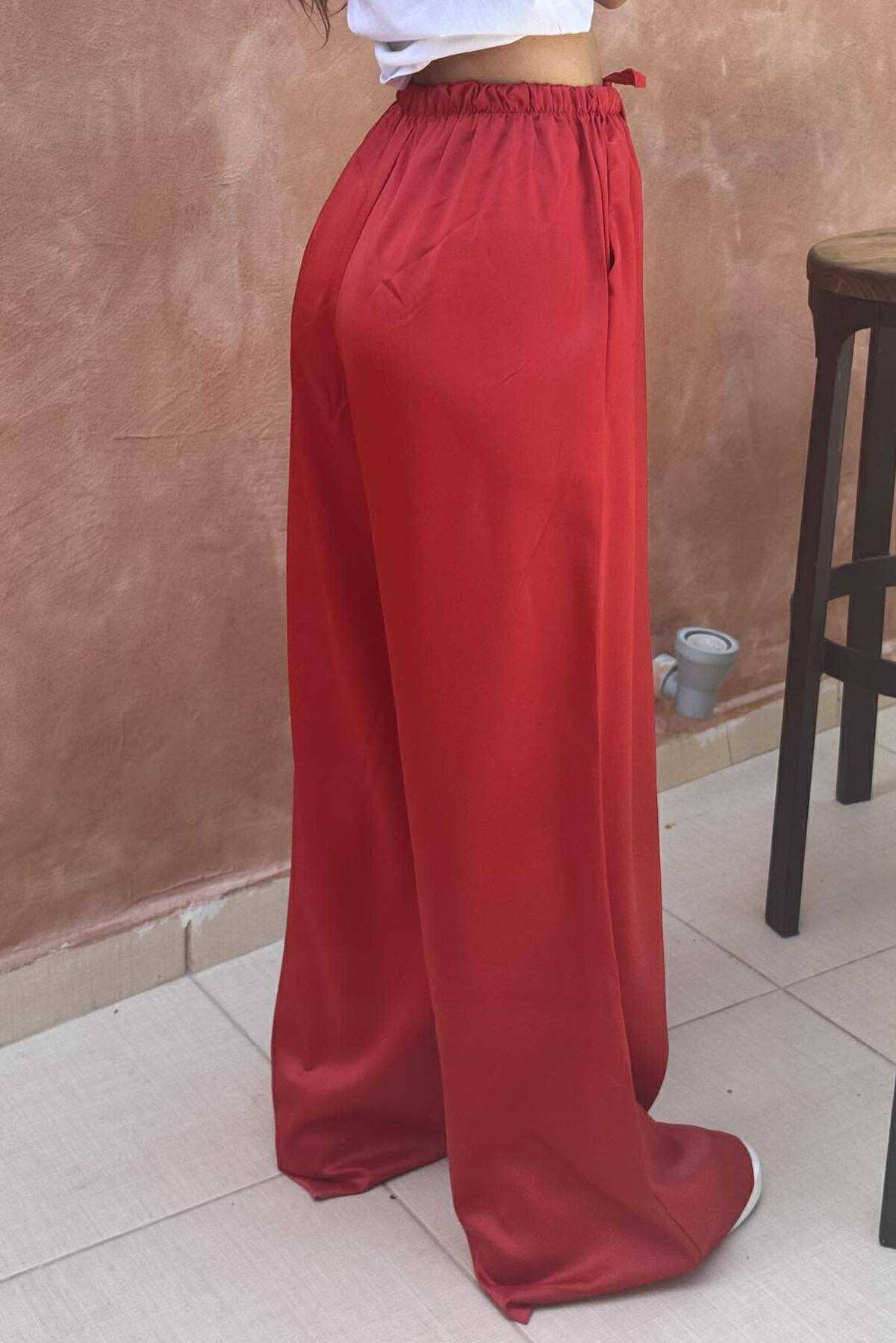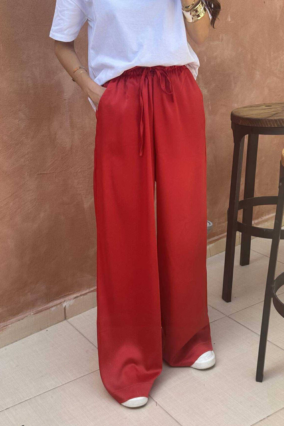 PANTALLONA SATEN ELASTIKE NË BELI DHE ME LIDHËSE PËR FEMRA NË NGJYRËN KUQE