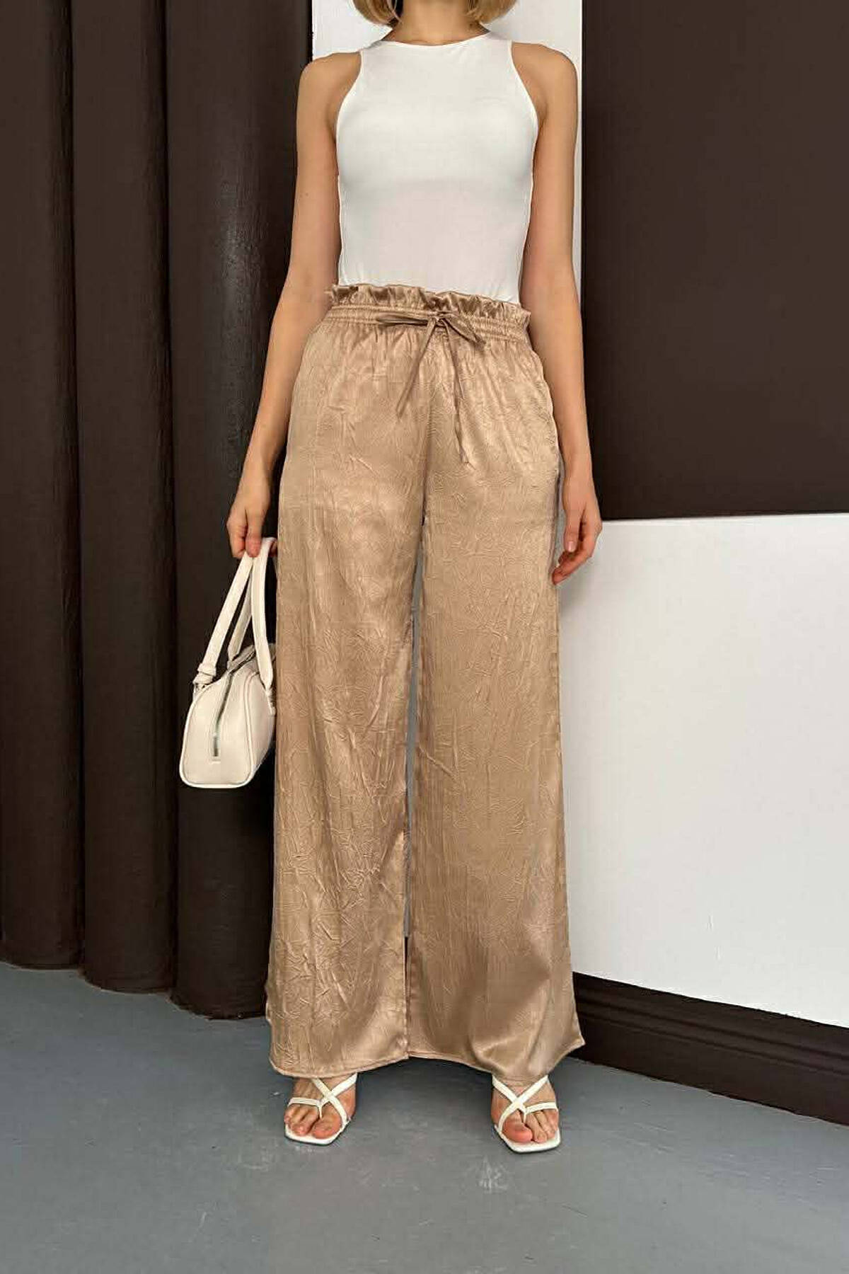 PANTALLONA TE GJERA NJE NGJYRESHE ME DETAJIN E RRIPIT PER FEMRA NE NGJYRE BEZHE
