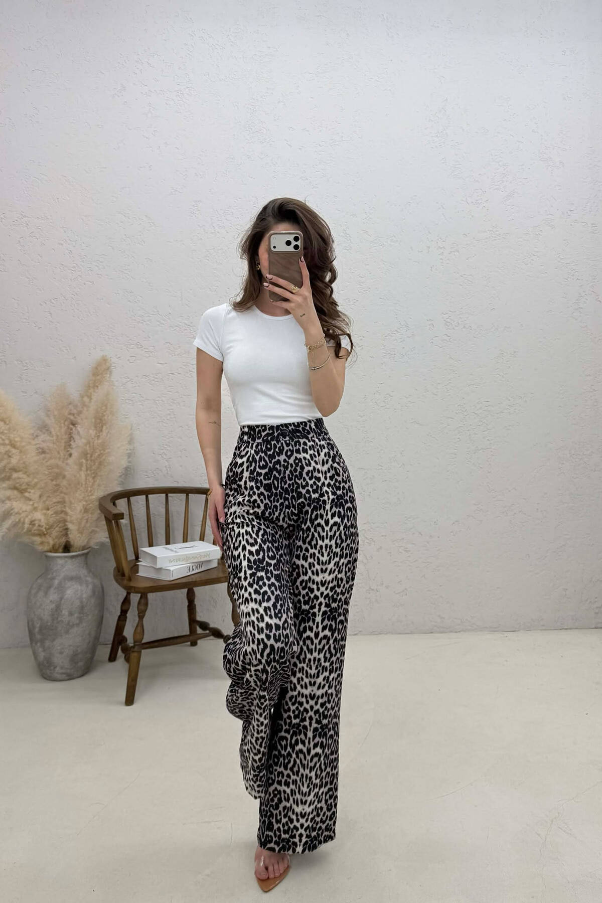 PANTALLONA TE GJERA ME DIZAJN LEOPRAD PER FEMRA NE NGJYRE BEZHE