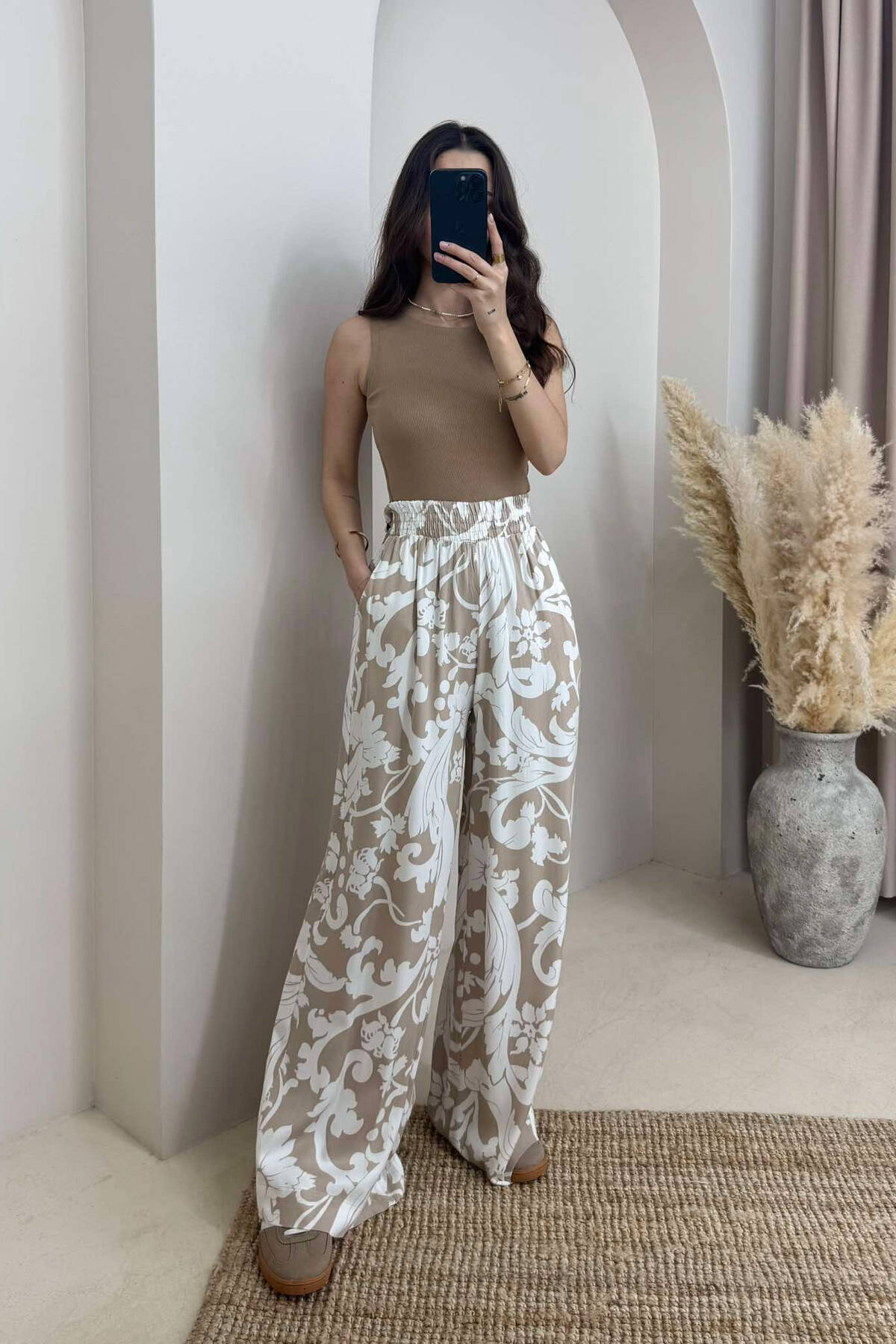 PANTALLONA TË GJERA ME DIZAJNE TË NDRYSHME PËR FEMRA NË NGJYRËN KREM+BEZHË