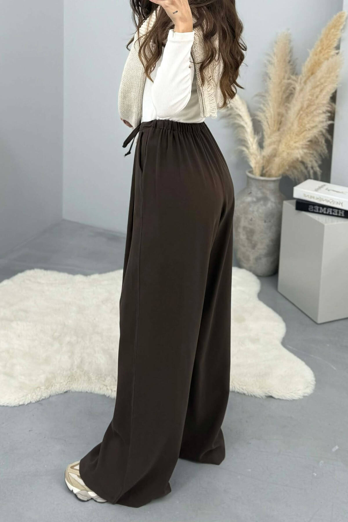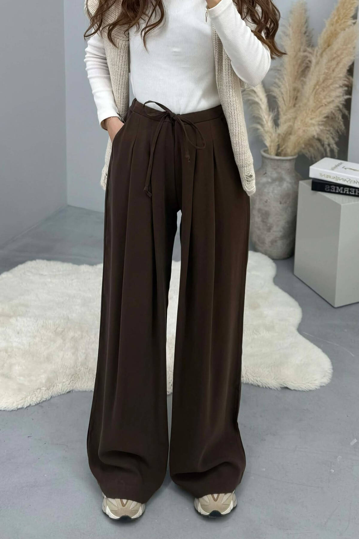 PANTALLONA TE GJERA NJE NGJYRESHE ME BEL GJYSEM ELASTIK PER FEMRA NE NGJYRE KAFE
