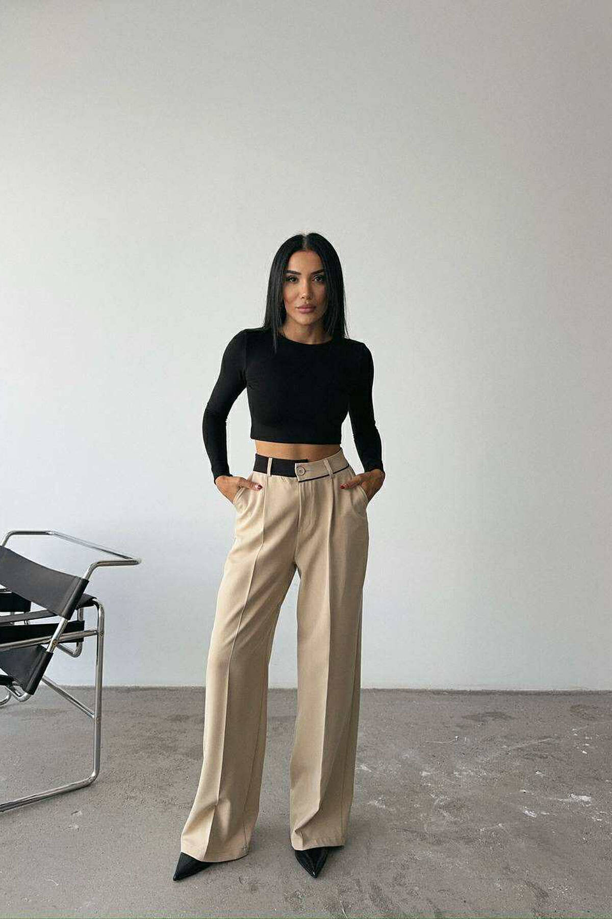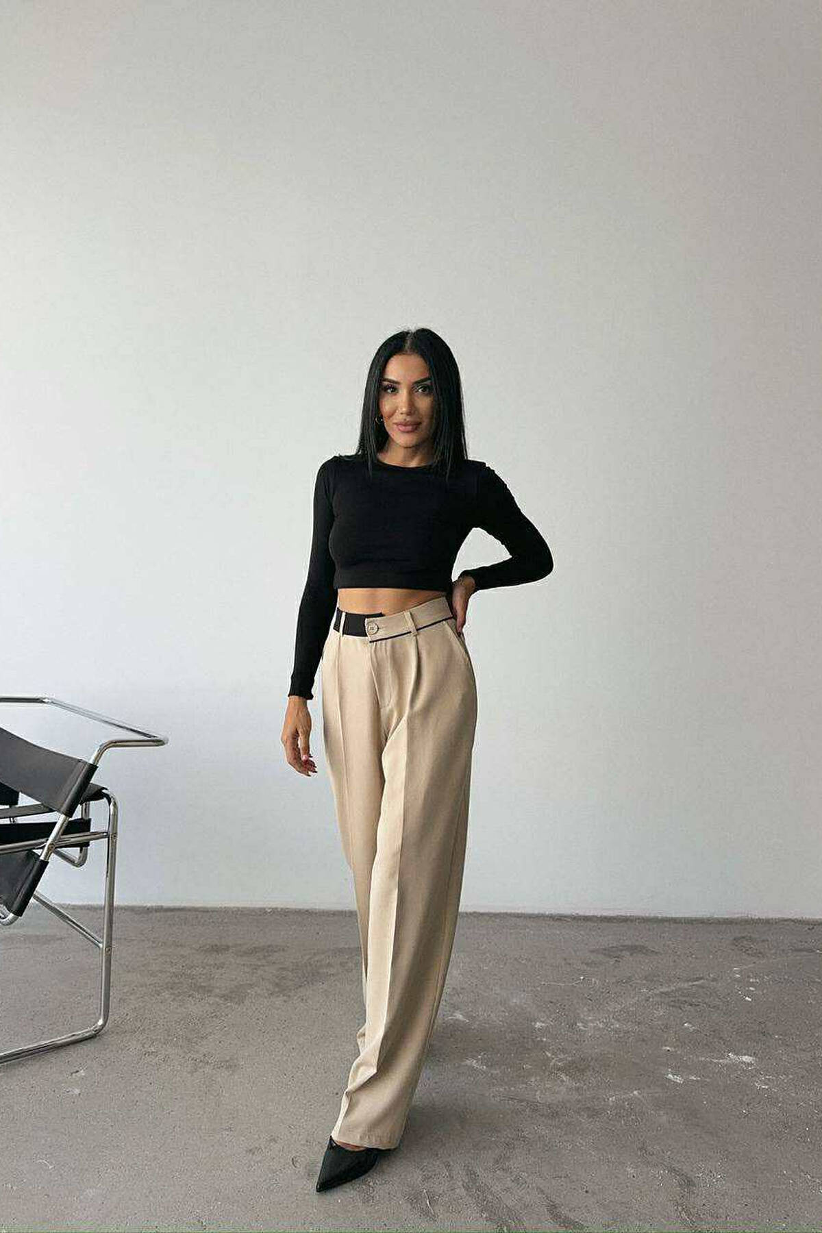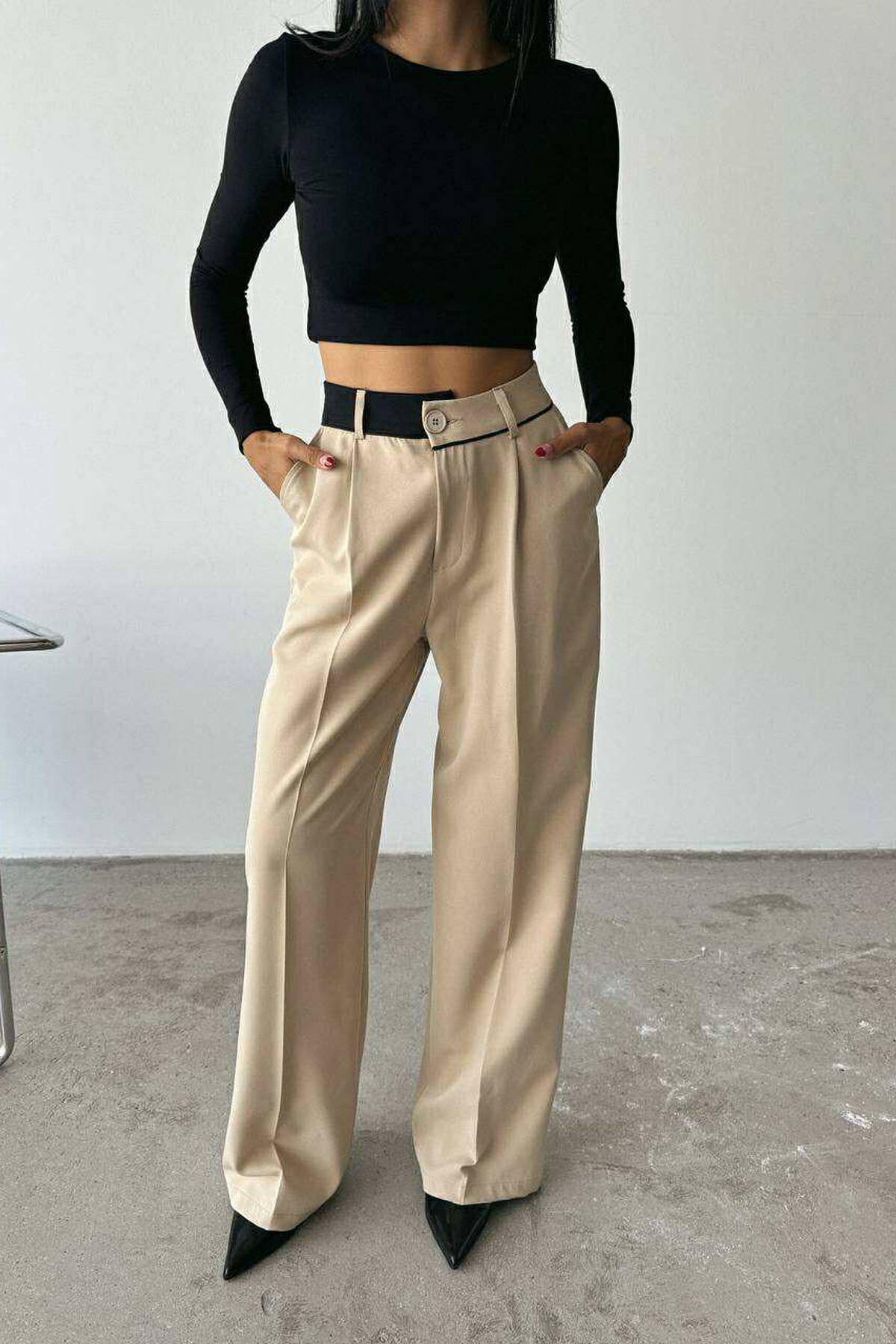 PANTALLONA TE GJERA NJE NGJYRESHE ME DETAJIN E RRIPIT PER FEMRA NE NGJYRE BEZHE