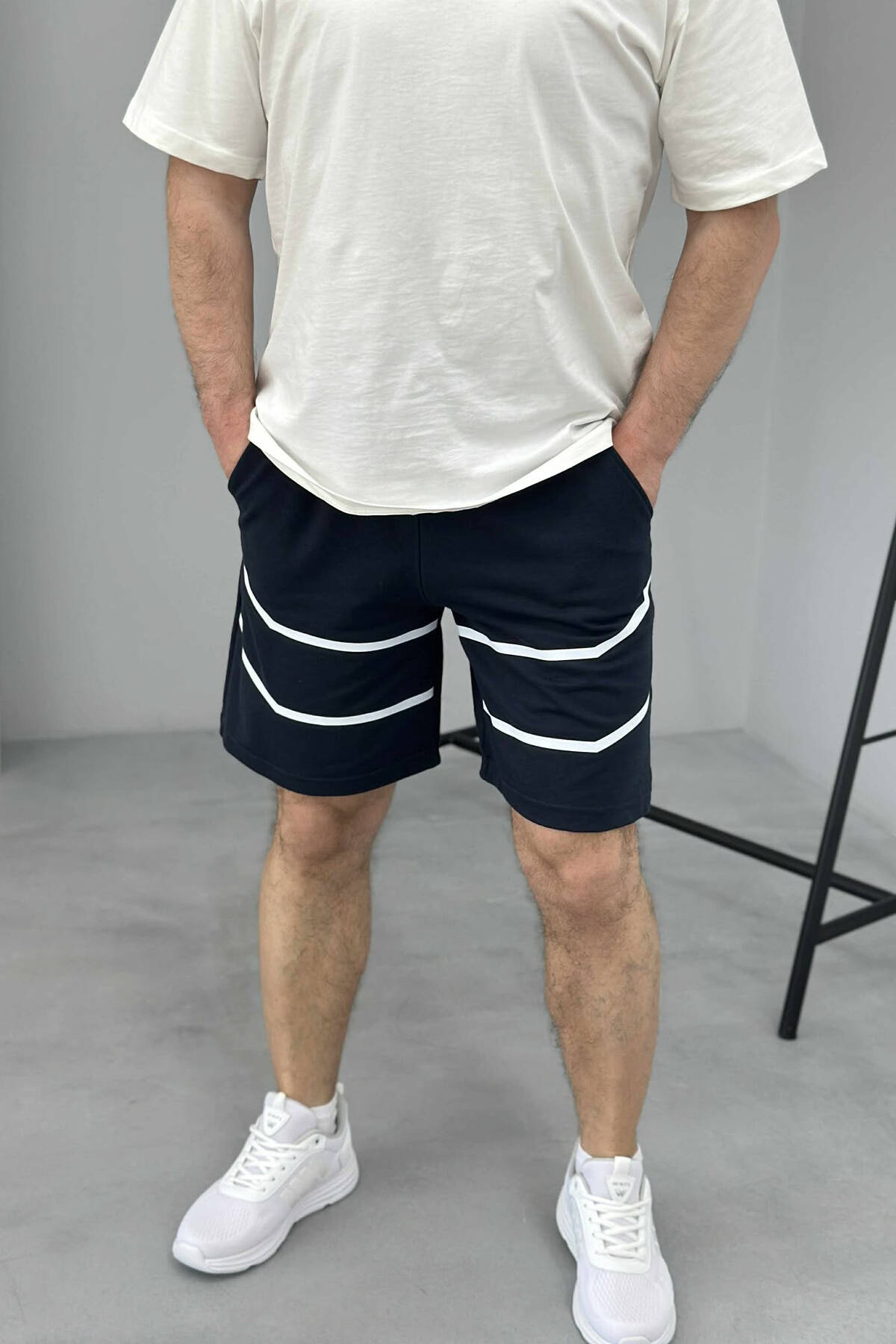 PANTALLONA TË SHKURTRA ME VIJA PËR MESHKUJ NË NGJYRËN BLU E ERRËT