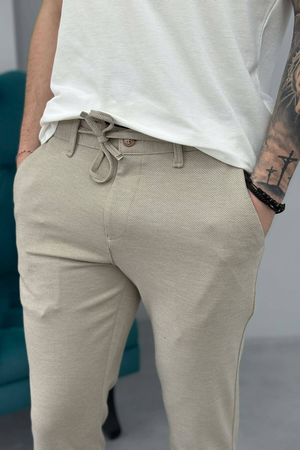 PANTALLONA NJE NGJYRESHE TE THJESHTA ME LIDHESE NE BEL PER MESHKUJ NE NGJYRE BEZHE