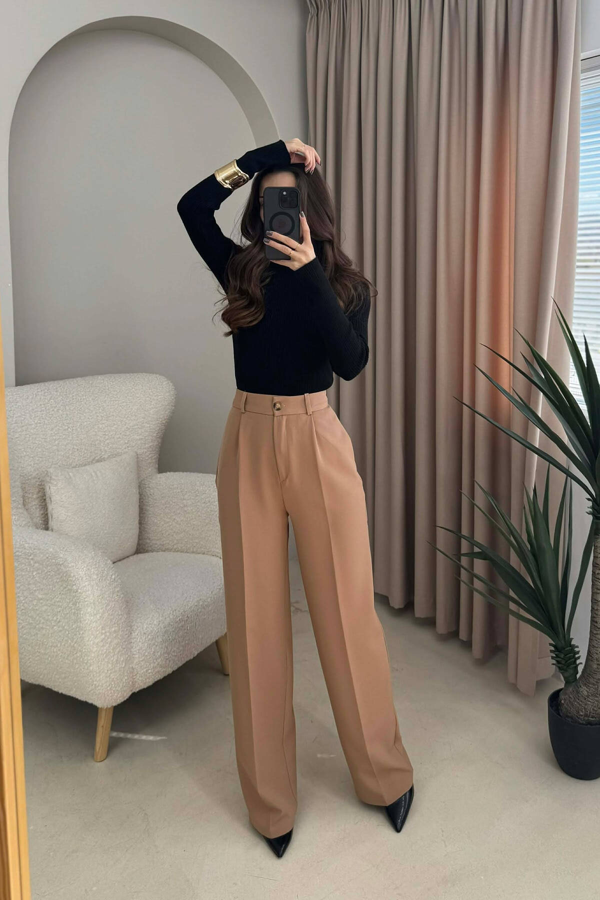 PANTALLONA TË THJESHTA NJË NGJYRËSHE PËR FEMRA NË NGJYRËN KAFE E ZBARDHUR