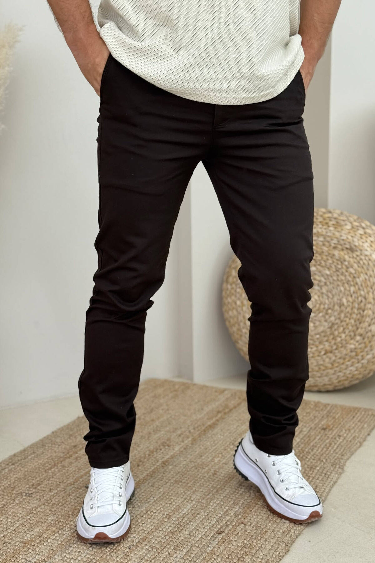 PANTALLONA NJË NGJYRËSHE TË THJESHTA PËR MESHKUJ NË NGJYRËN KAFE E ERRËT