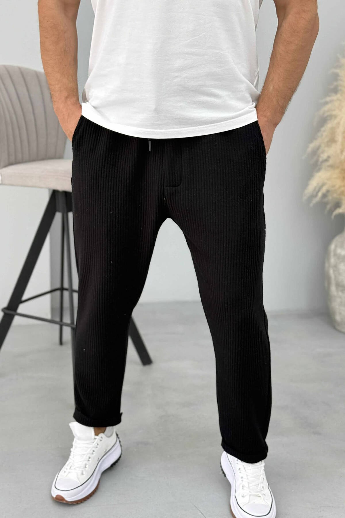 PANTALLONA TË THJESHTA NJËNGJYRËSHE DHE ME LIDHËSE PËR MESHKUJ NË NGJYRËN E ZEZË