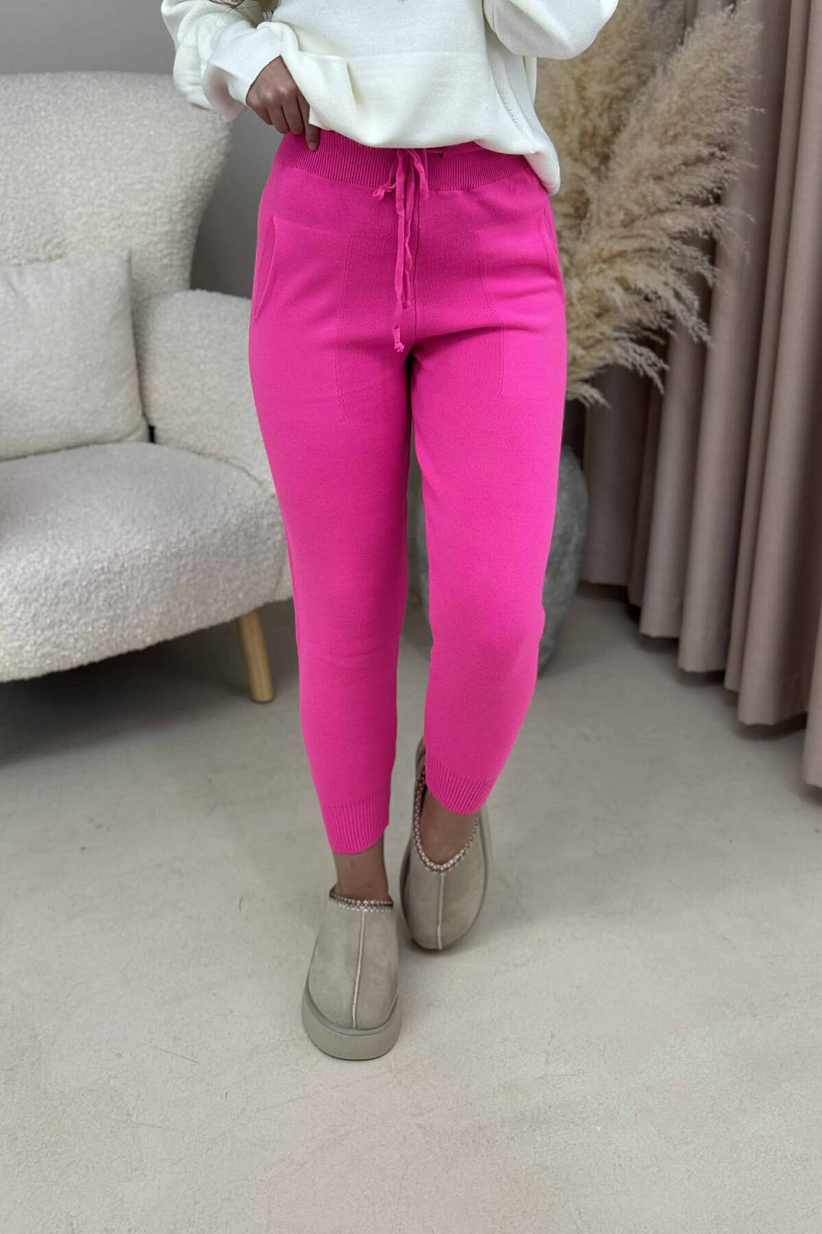 PANTALLONA TË THURRURA NJË NGJYRËSHE ME LIDHËSE PËR FEMRA NË NGJYRË ROZË
