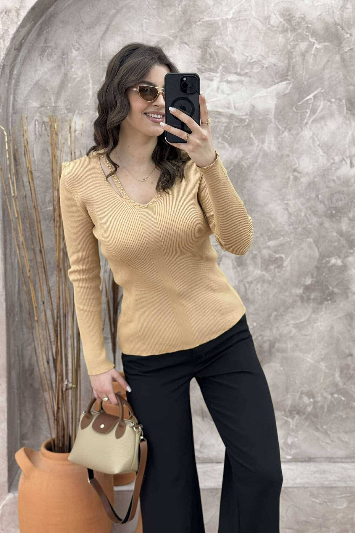 V NECK SIMPLE WOMEN SWEATER BEIGE/BEZHE