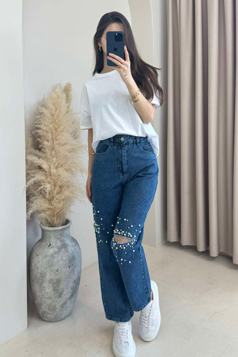 PEARL DETAILS WIDE LEG WOMEN JEANS BLUE/BLU