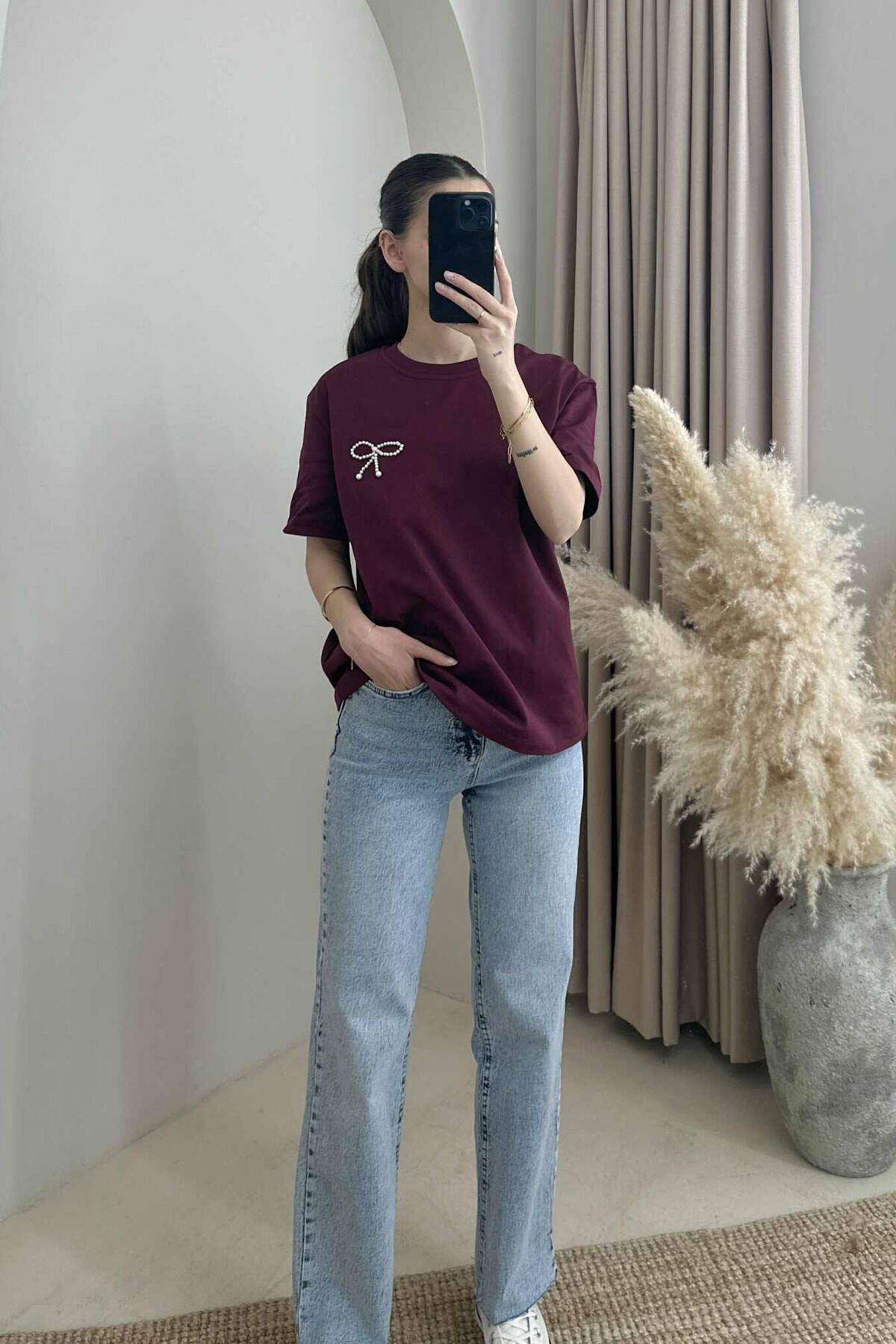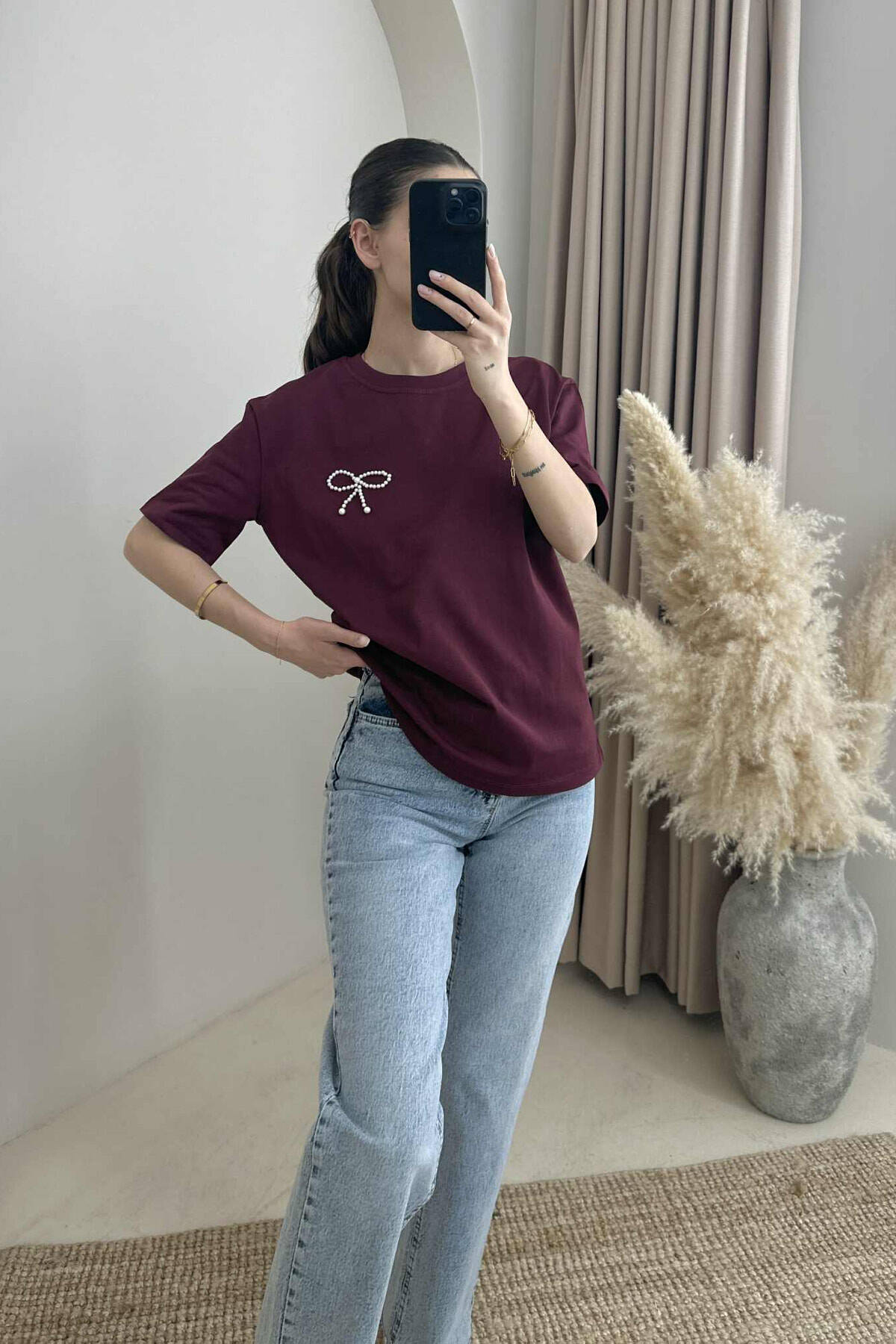 PEARL RIBBON DETAIL SIMPLE WOMEN T-SHIRT BURGUNDY/VISHNJE