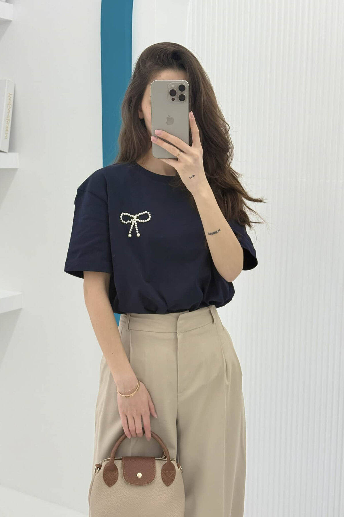 PEARL RIBBON DETAIL SIMPLE WOMEN T-SHIRT DARK BLUE/BEE