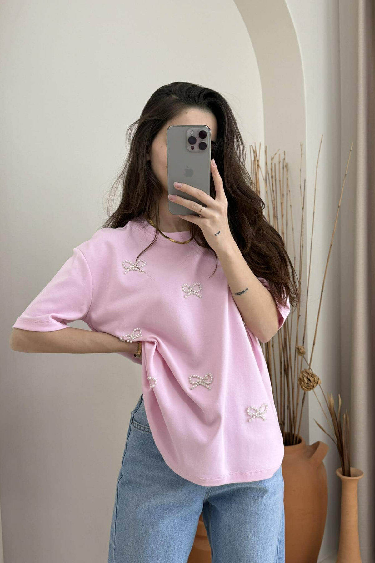 PEARL RIBBON DETAIL SIMPLE WOMEN T-SHIRT PINK/ROZE