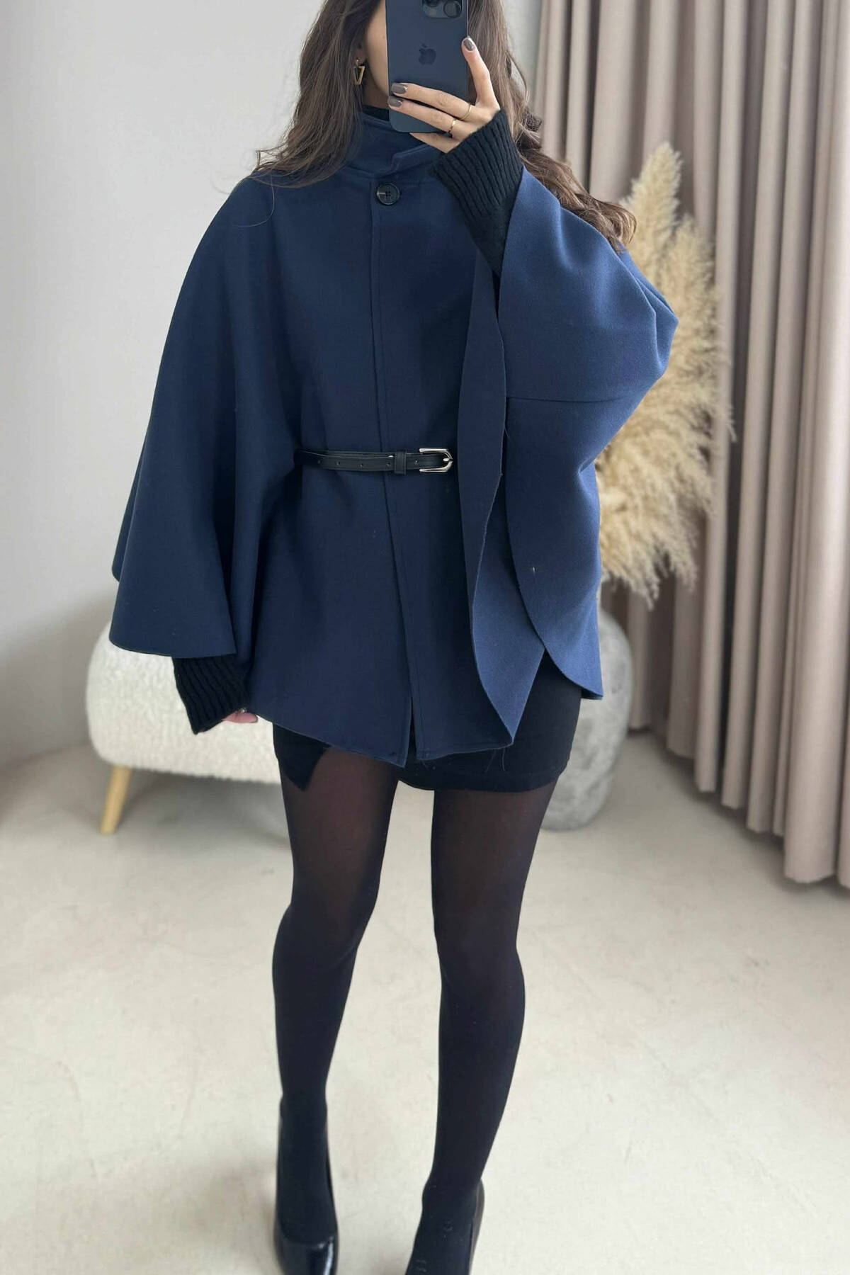 PELERINË NJË NGJYRËSHE ME DETAJIN E RRIPIT PËR FEMRA NË NGJYRË BLU