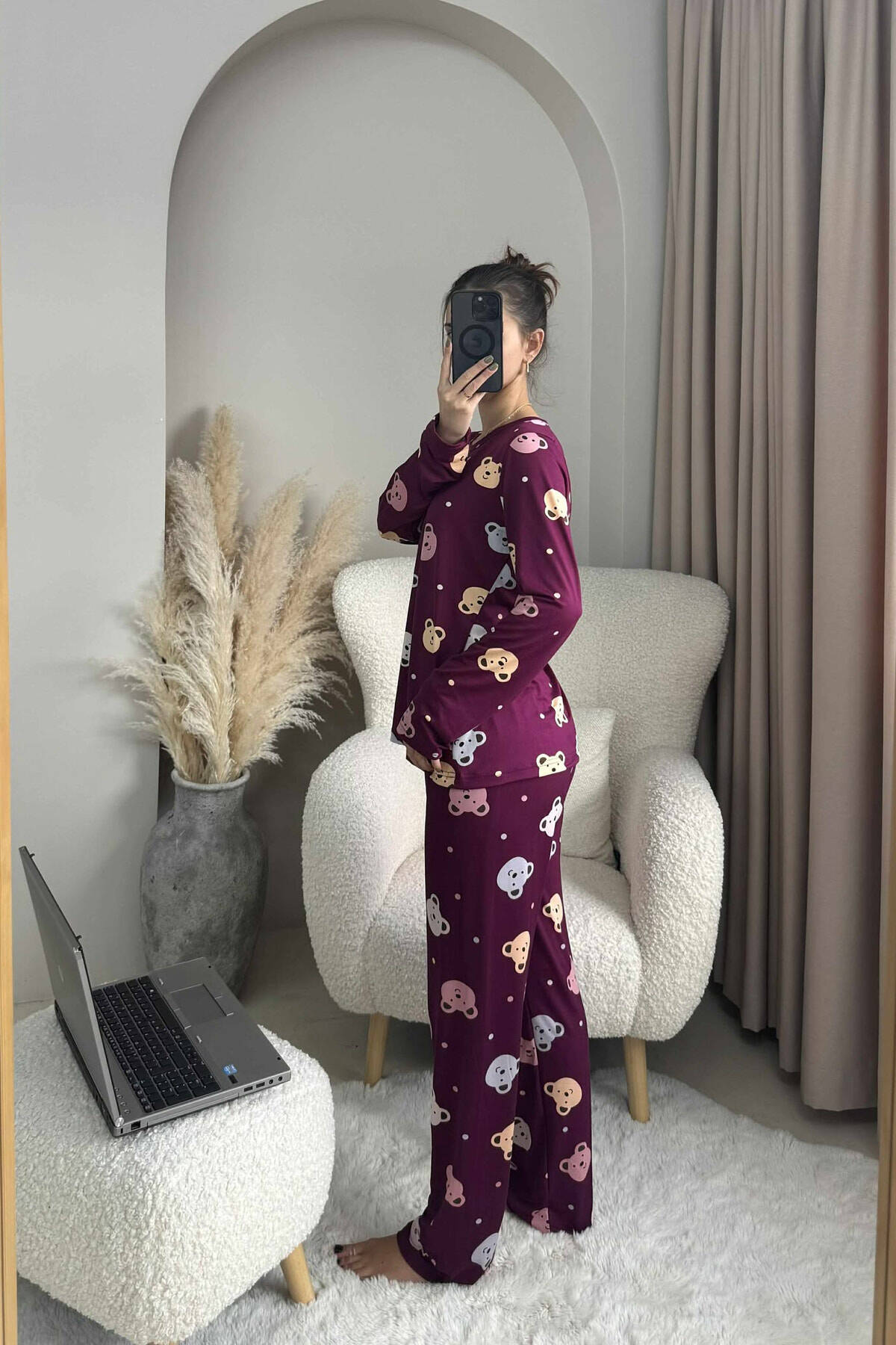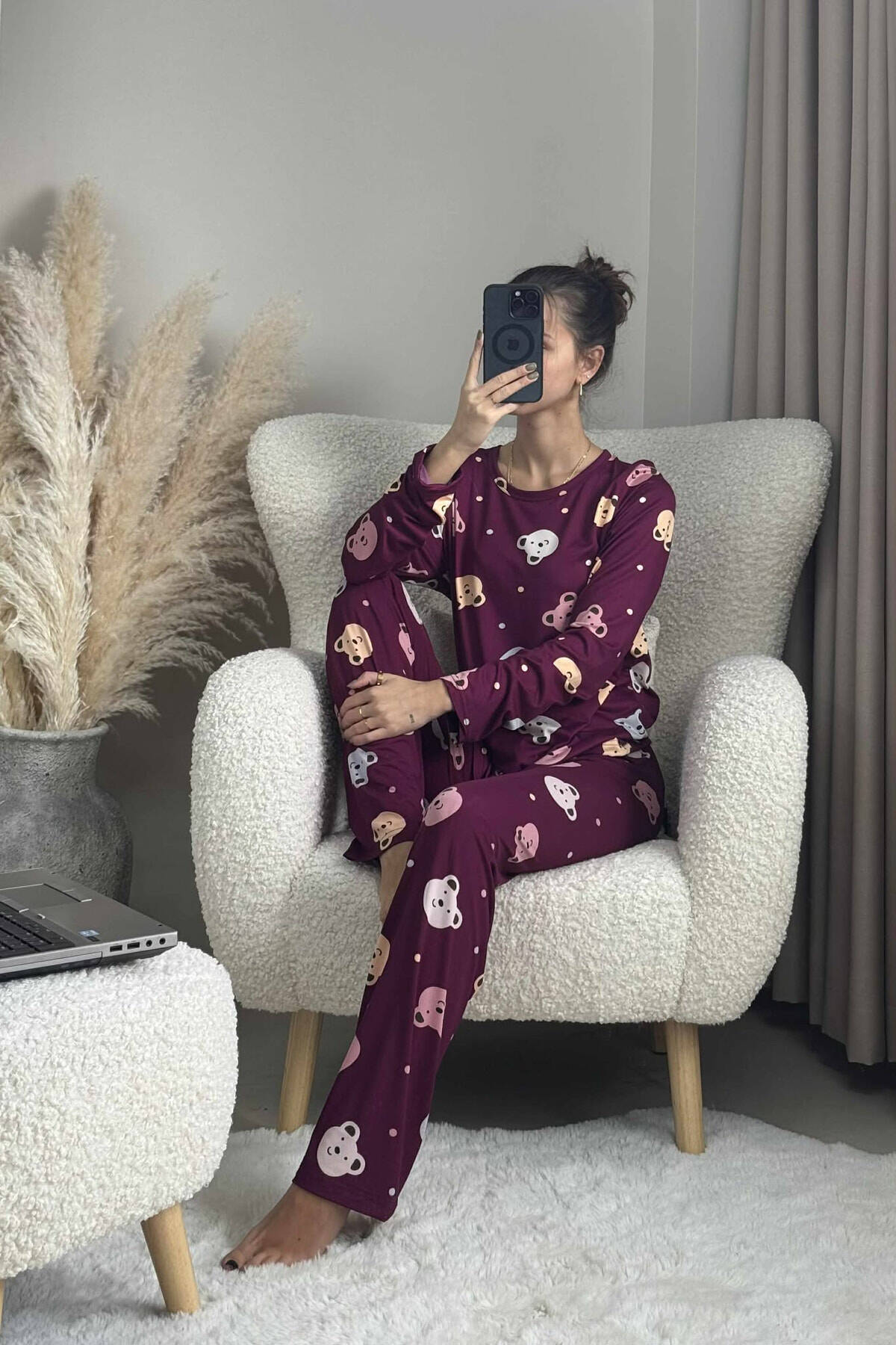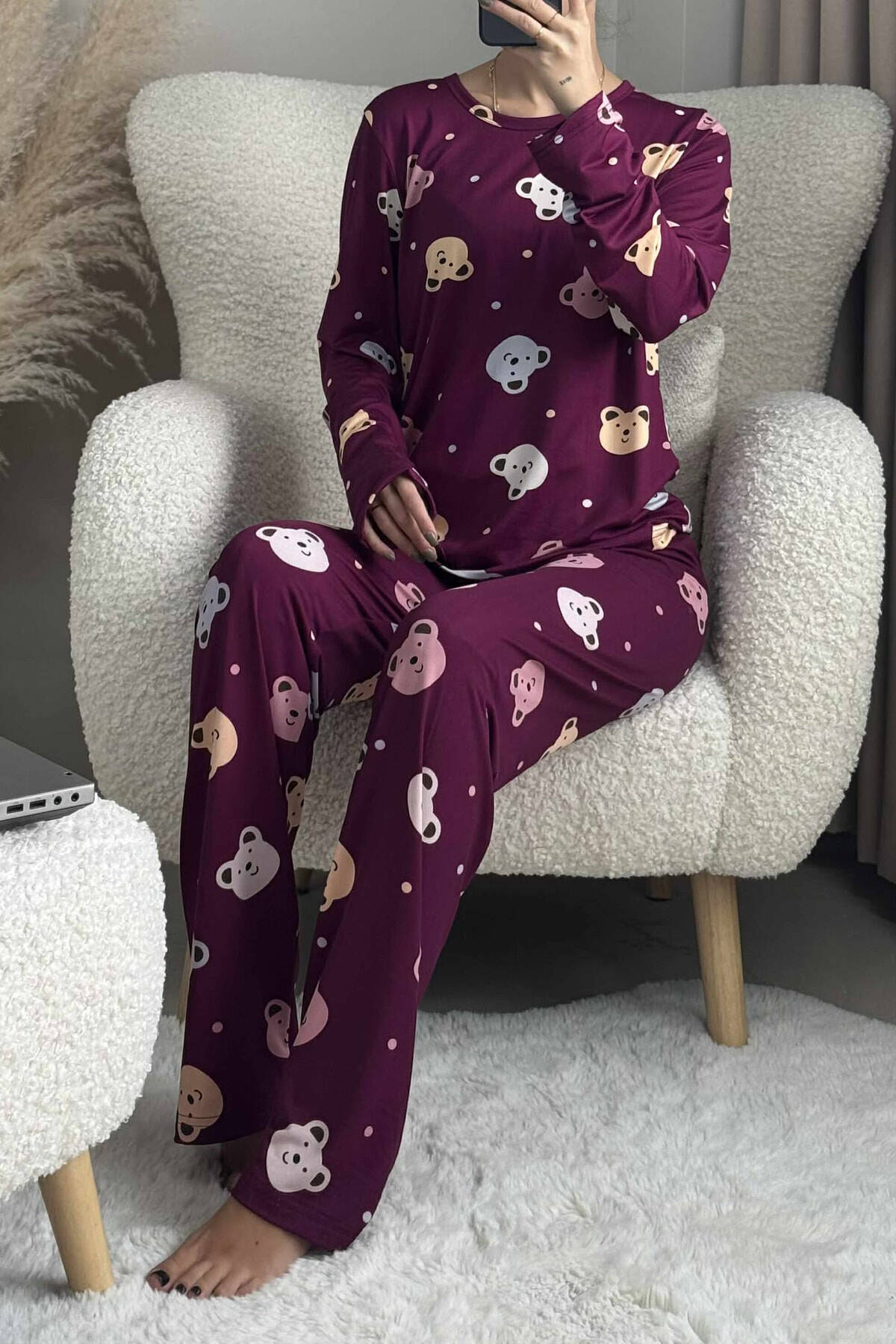 PIZHAMA BLUZË ME DIZJAN ME ARUSH+PANTALLONA PËR FEMRA NË NGJYRË VISHNJË TË ERRËT