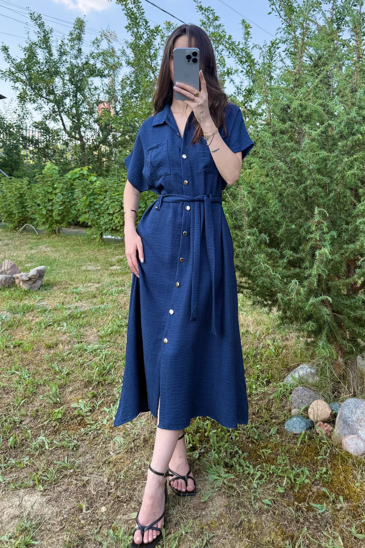 POCKETS DETAIL POLO NECK LACING WOMEN DRESS DARK BLUE/BEE