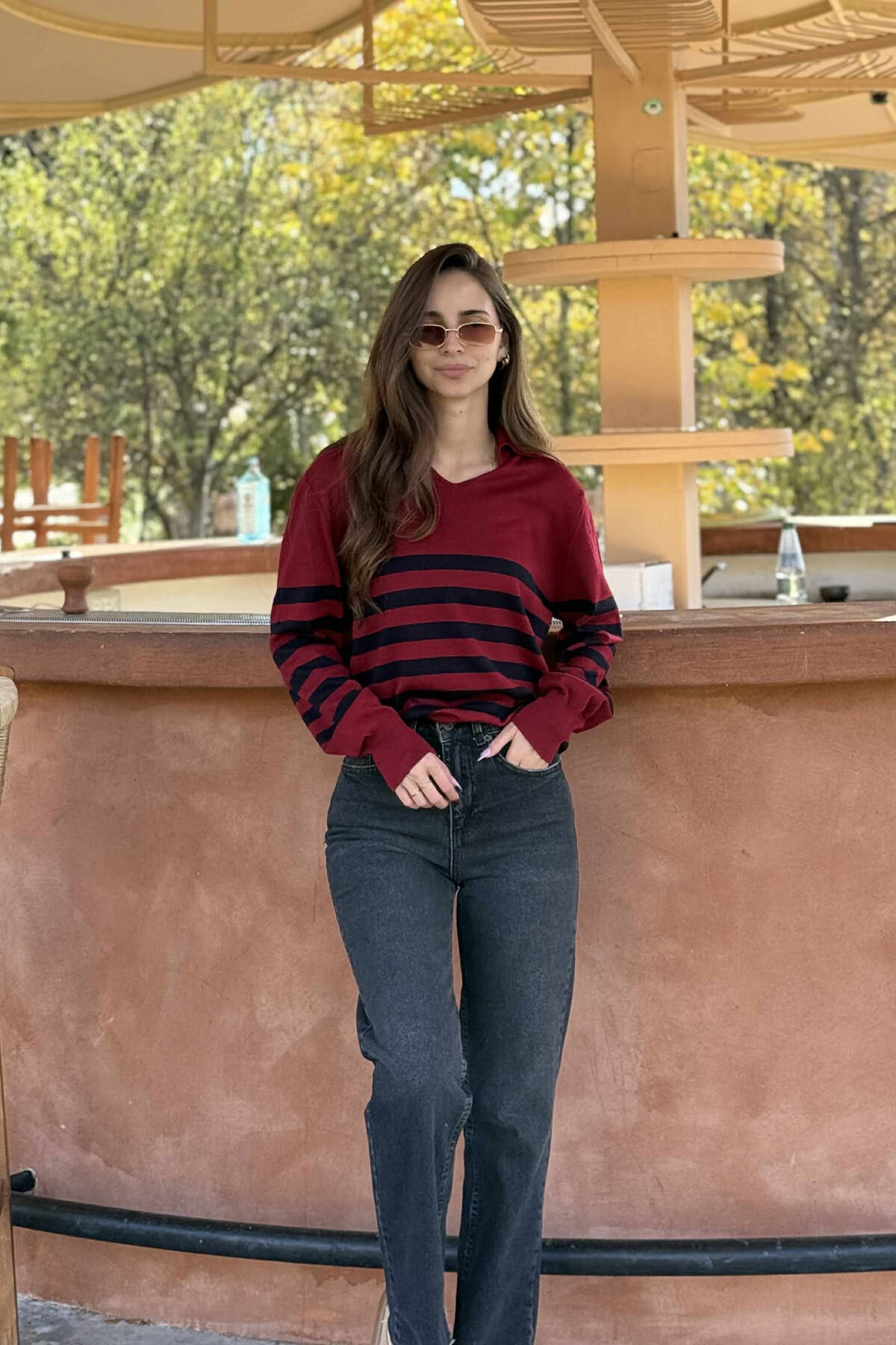 POLO NECK STRIPE DESIGN WOMEN SWEATER BURGUNDY/VISHNJE