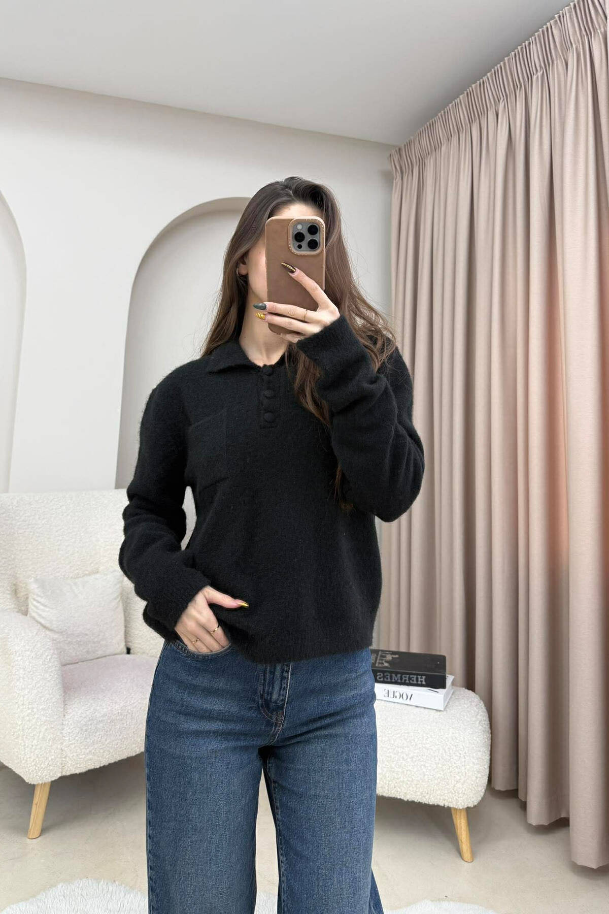 POLO NECK BUTTONS SINGLE POCKET WOMEN SWEATER BLACK/ E ZEZE