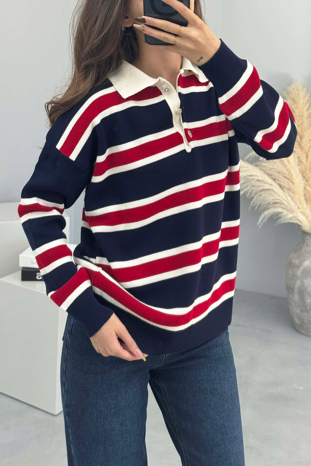 POLO NECK BUTTONS STRIPED WOMEN SWEATER BLUE+RED/BLU-KUQE