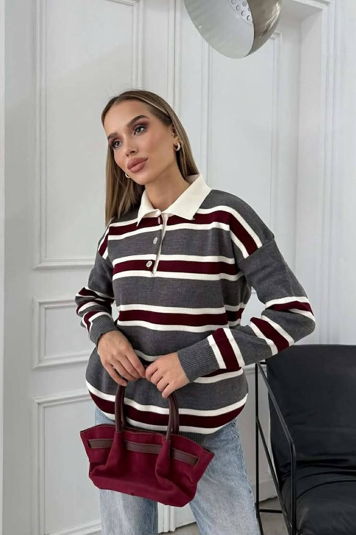 POLO NECK BUTTONS STRIPED WOMEN SWEATER GREY-BURGUNDY/GRVI