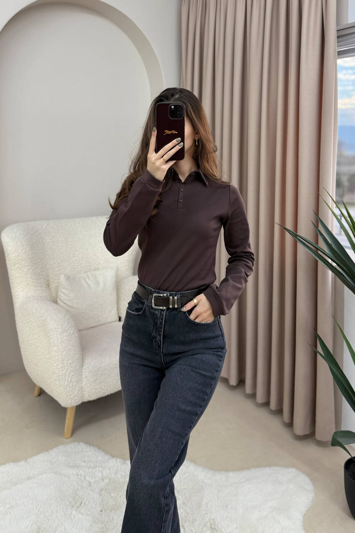 POLO NECK BUTTONS WOMEN SWEATSHIRT DARK BROWN/KAE