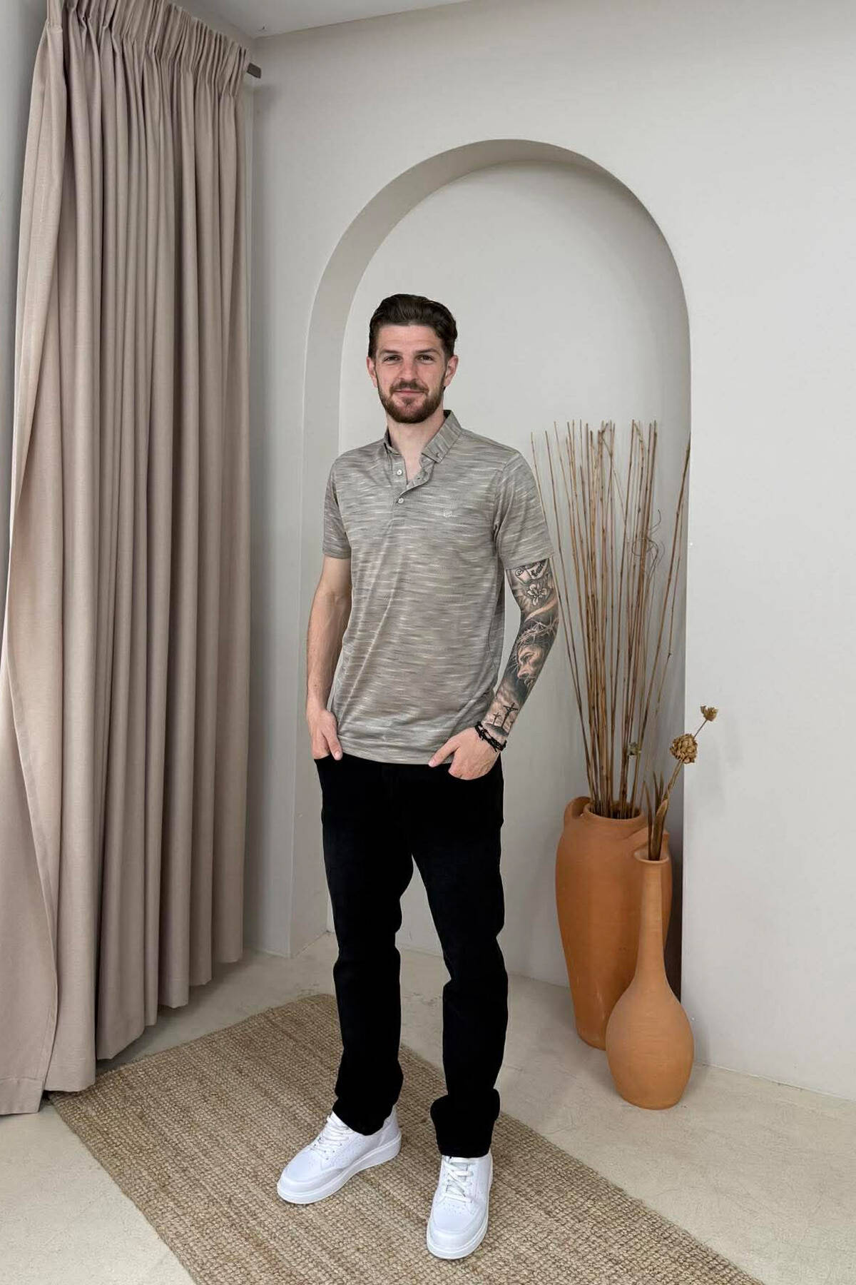TEXTURED POLO NECK MEN T SHIRT BEIGE/BEZHE