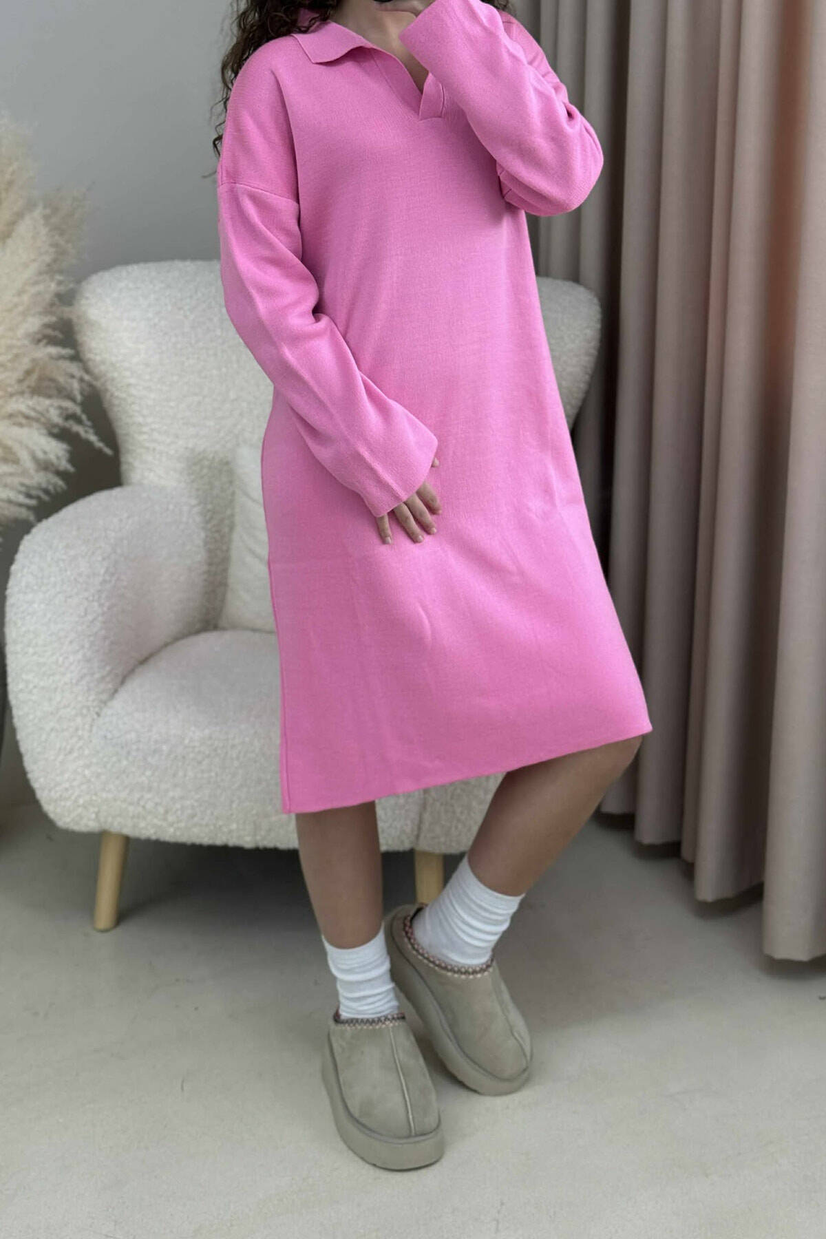 POLO NECK ONE COLOR KNITTED WOMEN DRESS PINK/ROZE